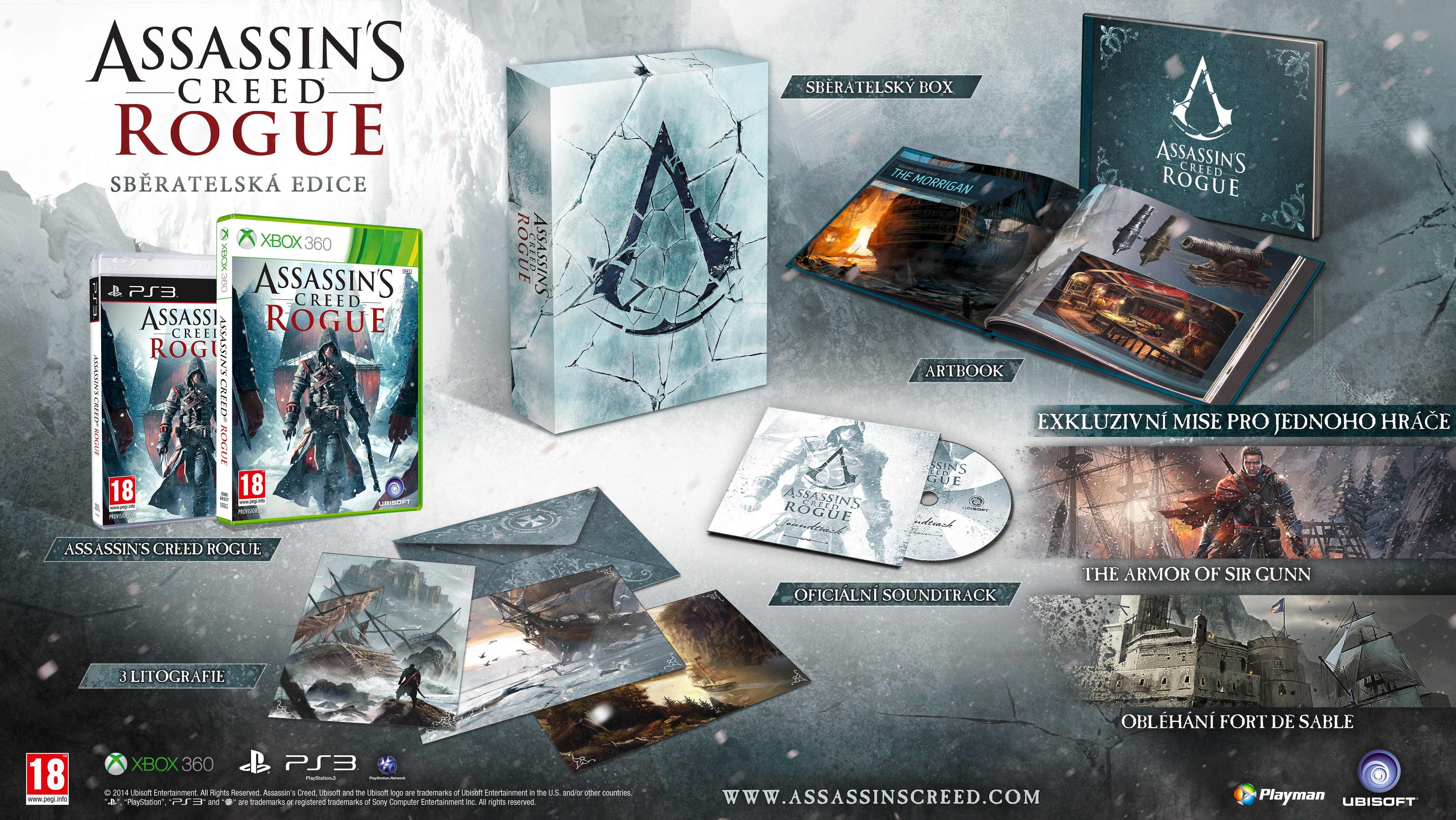 Assassins Creed Rogue nás zavede do poloviny 18. století během tzv. Sedmileté války, války, která dovedla velkou a silnou Francii do finančních problémů jejíž konec pak přinesl revoluci. Ve hře navštívíte místa jako je zamrzlý severní Atlantik a to i s polární září, Appalačské údolí nacházející se na východě USA a New York. Všechny tři prostředí budou rozlehlé, rozmanité a nadmírnu nebezpečné. Připravte se na oceán s plujícími ledovci, nedotčenou přírodu, nebo New York odpovídající danému datu. Co je však nejnovější je hlavní hrdina, který je na opačné straně, než Vám doposavad nabízela série Assassins Creed, hrajete za templáře jménem Shay Patrick Cormac, který přetrpí zradu bratrstva a stane se obávaným lovcem assassinů. Celou hru projdete změnou, proměnou z dobrodružného assasína v nebezpečného a hlavně odhodlaného Templáře. Lov může začít!Sběratelská kusově omezená edice obsahuje navíc: artbook, soundtrack, 3 litografické pohlednice ve stylové obálce, dvě bonusové mise: The Siege of Fort de Sable Mission a The armor of Sir Gunns Quest. Vše zabeleno ve sběratelském boxu. Všechny bonusy najdete zde.