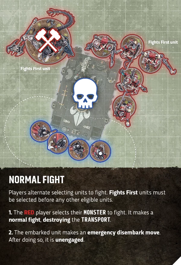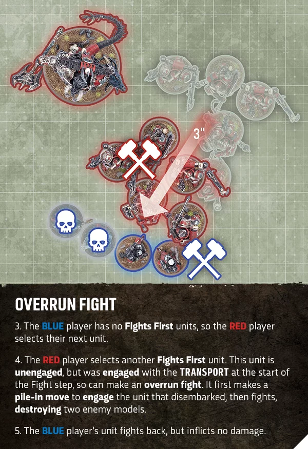 Nové pravidlo říká, že pokud máte transport, který je v souboji na blízko, jednotka v něm může vystoupit přímo do boje. Jednotka však bude Battle-shocked a může mít ztráty.