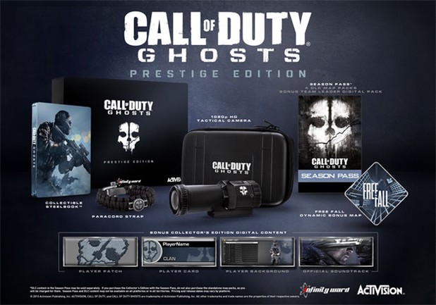 Prestige edice bude obsahovat hru, steelbook, přístup k Season Pass, náramek Paracord, kameru s HD rozlišením s 4GB kartou, softwarem na upravování videa a ingame bonusy v podobě soundtracku, map a zbraní, mapa Free Fall bude dle Activision přístupná jen pro předobjednávky!! Celé balení zde.