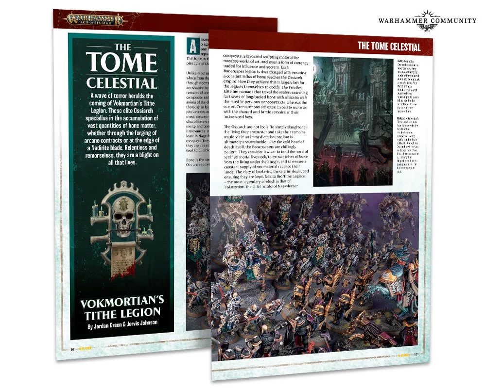 The dead have come to claim the bone tithe in this month’s Tome Celestial. It’s all about Vokmortian’s Tithe Legion, who specialise in claiming immense quantities of bone for their dread master, be it by dark pacts or, er, more direct intervention.