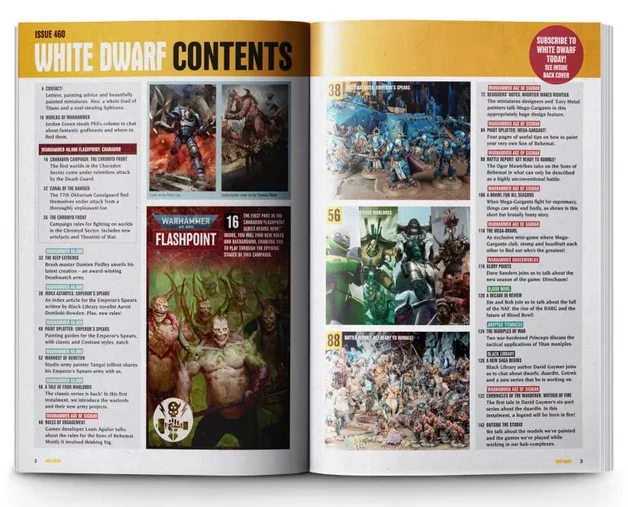 White Dwarf is Games Workshop's premium Warhammer magazine, packed with amazing content each month such as new rules and background, short stories, regular columns, special guests, and more.Here’s what you can look forward to in January’s issue:Contact!Letters, painting advice and beautifully painted miniatures. Also, a whole load of Titans and a soul-stealing Sphiranx.Worlds of WarhammerJordan Green steals Phil’s column to chat about fantastic godbeasts and where to find them.Outside the StudioWe talk about the models we’ve painted and the games we’ve played while working in our hab-complexes.Warhammer 40,000Flashpoint: CharadonCharadon Campaign: The Chromyd FrontThe first worlds in the Charadon Sector come under relentless attack by the Death Guard.Canal of the DamnedThe 77th Okharium Canalguard find themselves assailed by a thoroughly unpleasant foe.The Chromyd FrontCampaign rules for fighting on worlds in the Chromyd Sector. Includes three new Theatres of War on the Chromyd Front, each with their own unique rules, as well as three Chromyd Crusade Relics.The Keep ExtremisBrush-master Damien Pedley unveils his latest creation – an award-winning Deathwatch army.Index Astartes: Emperor’s SpearsAn Index article for the Emperor’s Spears written by Black Library novelist Aaron Dembski-Bowden and Warhammer 40,000 rules writer Elliot Hamer.Paint Splatter: Emperor’s SpearsPainting guides for the Emperor’s Spears – Classic and Contrast styles, naturally.Warhost of NemetonStudio army painter Tangui Jollivet shares his Emperor’s Spears army with us.A Tale of Four WarlordsThe classic series is back! In this first instalment, we introduce the warlords and their new army projects.Warhammer Age of SigmarRules of EngagementGames developer Louis Aguilar talks about the rules for the Sons of Behemat. It mostly involved thinking big.Designers’ Notes: Mightier Makes RightierThe miniatures designers and ’Eavy Metal painters talk Mega-Gargants in this appropriately huge design feature.Paint Splatter: Mega-GargantsFour pages of useful tips on how to paint your very own Son of Behemat.Battle Report: Get Ready to Rumble!The Ogor Mawtribes take on the Sons of Behemat in a gigantic 3,000-point Battle Report, in what can only be described as a highly unconventional battle – featuring multiple boulders...A Brawl for All SeasonsWhen Mega-Gargants fight for supremacy, things can only end badly, as shown in this short but brutally funny story.The Mega-brawlAn exclusive mini-game where Mega-Gargants club, stomp, and headbutt each other to find out who’s the greatest!Warhammer UnderworldsGlory PointsDave Sanders joins us to talk about the new season of the game: Direchasm!Blood BowlA Decade in ReviewJim and Bob join us to talk about the fall of the NAF, the rise of the RARG, and the future of Blood Bowl!Adeptus TitanicusThe Maniples of WarTwo war-hardened Princeps discuss the tactical applications of Titan maniples.Black LibraryA New Saga BeginsBlack Library author David Guymer joins us to chat about dwarfs, duardin, Gotrek, and a new series that he is working on.Chronicles of the Wanderer: Mother of FireThe first tale in David Guymer’s six-part series about the duardin. In this instalment, a legend will be born in fire!