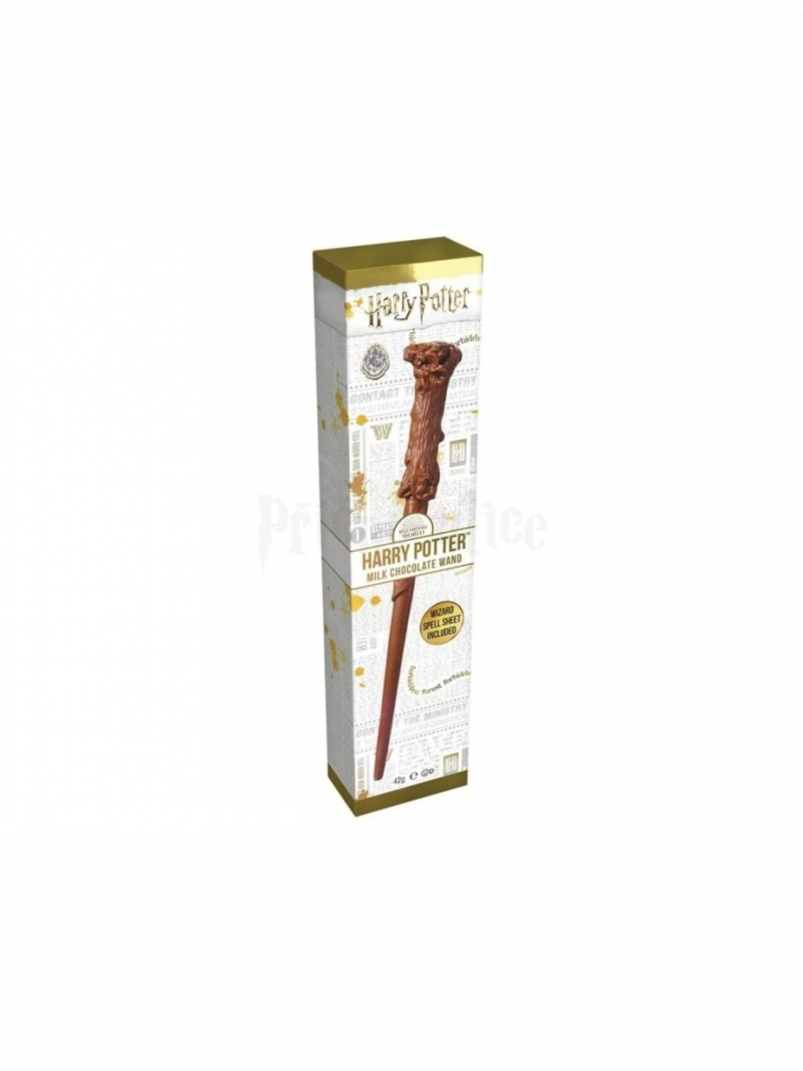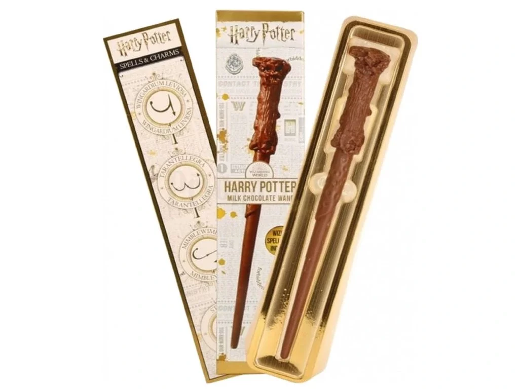 Podle knižní předlohy je Harryho hůlka je vyrobena z cesmínového dřeva a její jádro skrývá pero fénixe, ta naše pak z neodolatelně jemné mléčné čokolády.