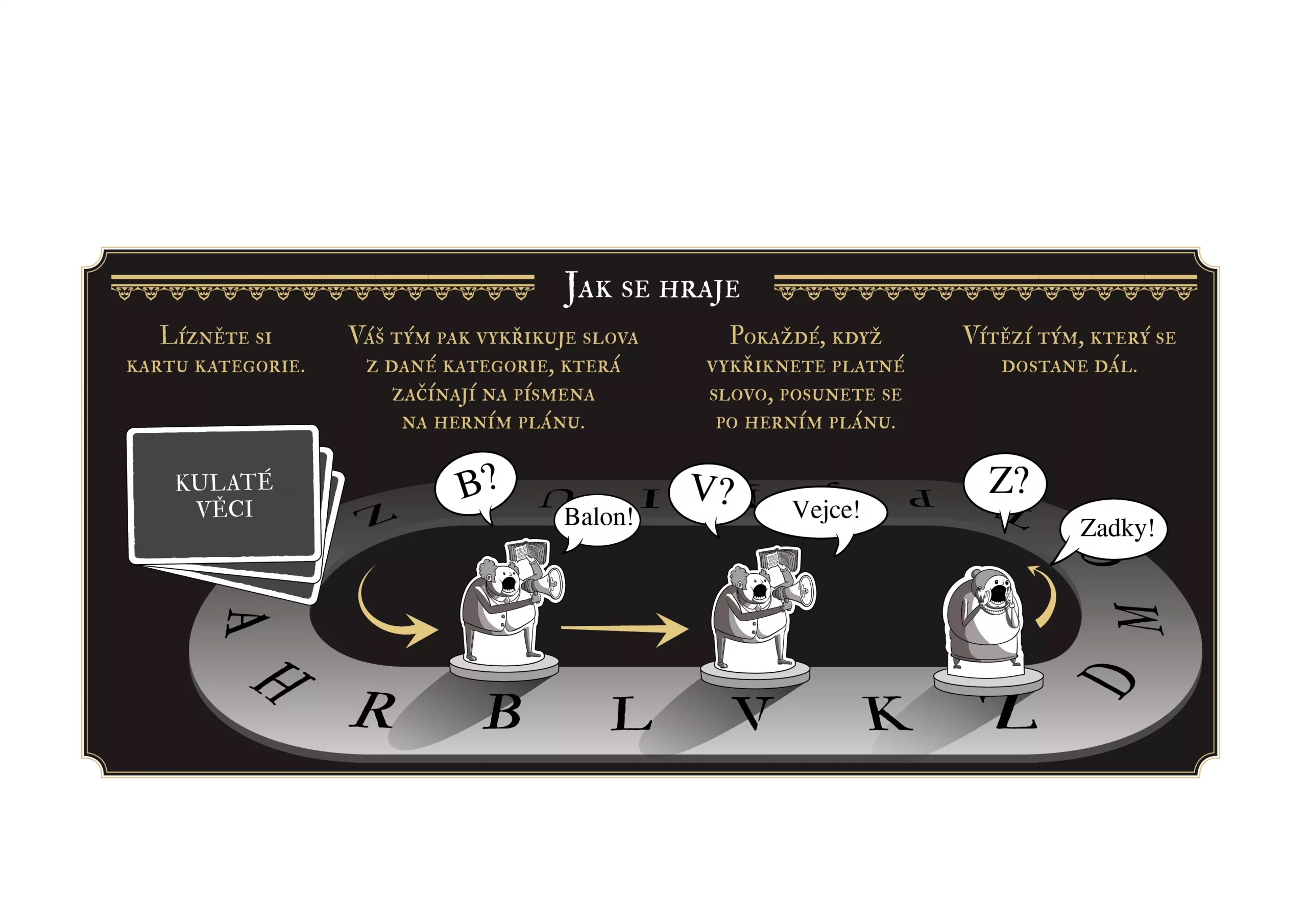 Ve zkratce - váš tým bude vykřikovat slova, která začínají na konkrétní písmeno a zapadají do určité kategorie. Počáteční písmena se změní pokaždé, když zakřičíte správnou odpověď, a pokud váš tým vymyslí víc slov než ten druhý, získáte body!