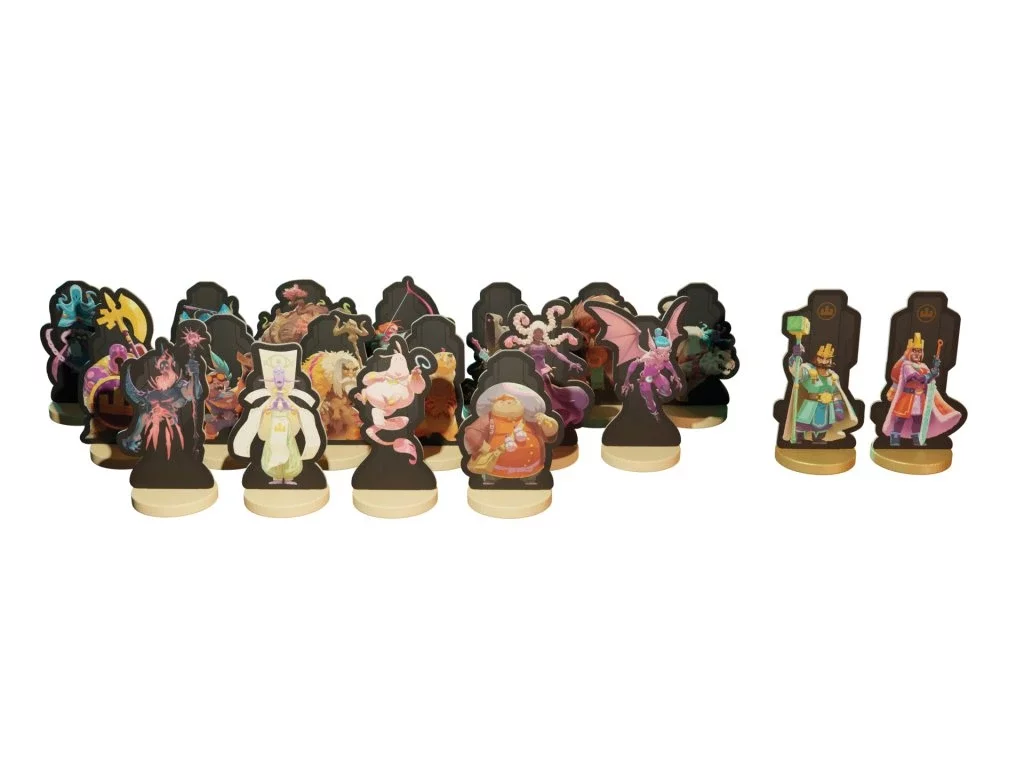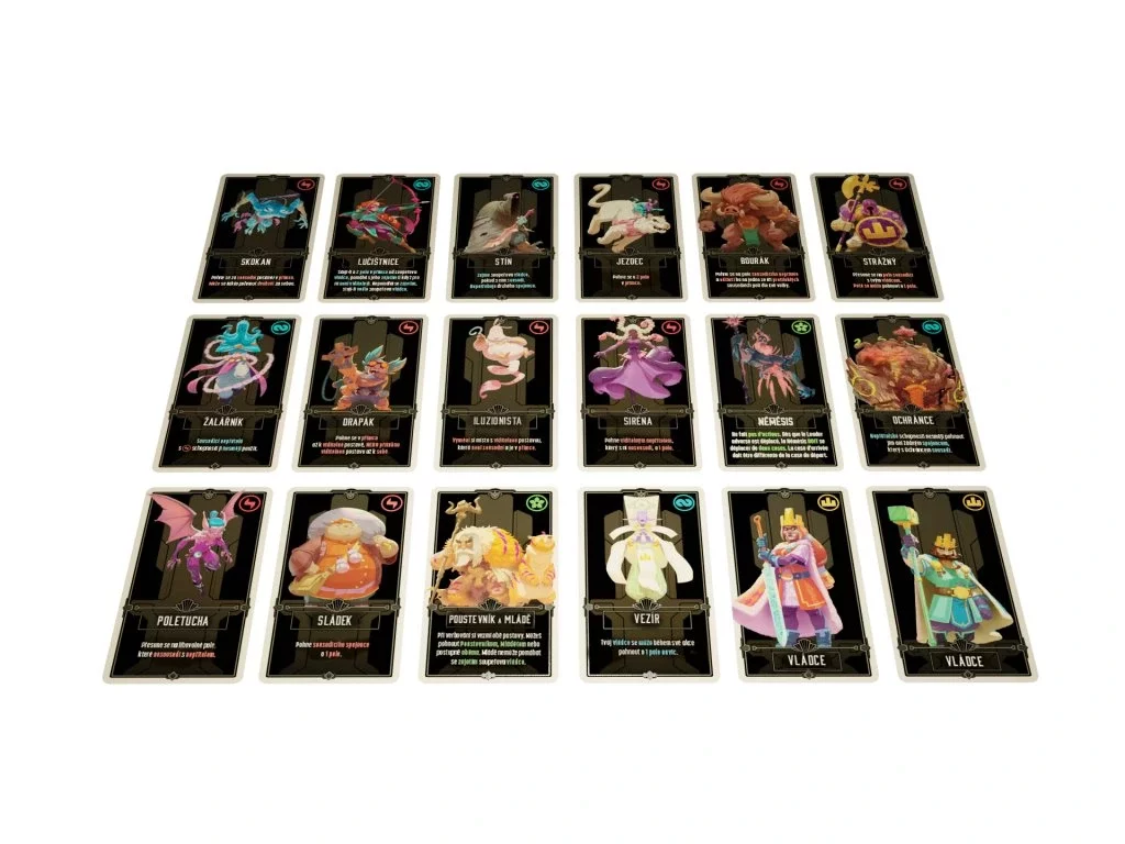 Sestav tým jedinečných postav a poraz svého soupeře! Vyhraješ, pokud se ti podaří postavit dvě své postavy vedle protivníkova vládce, tzn. zajmout jej, nebo pokud mazaně obklíčíš protivníkova vládce tak, aby kolem něj nezbylo žádné volné pole.OBSAH BALENÍ
