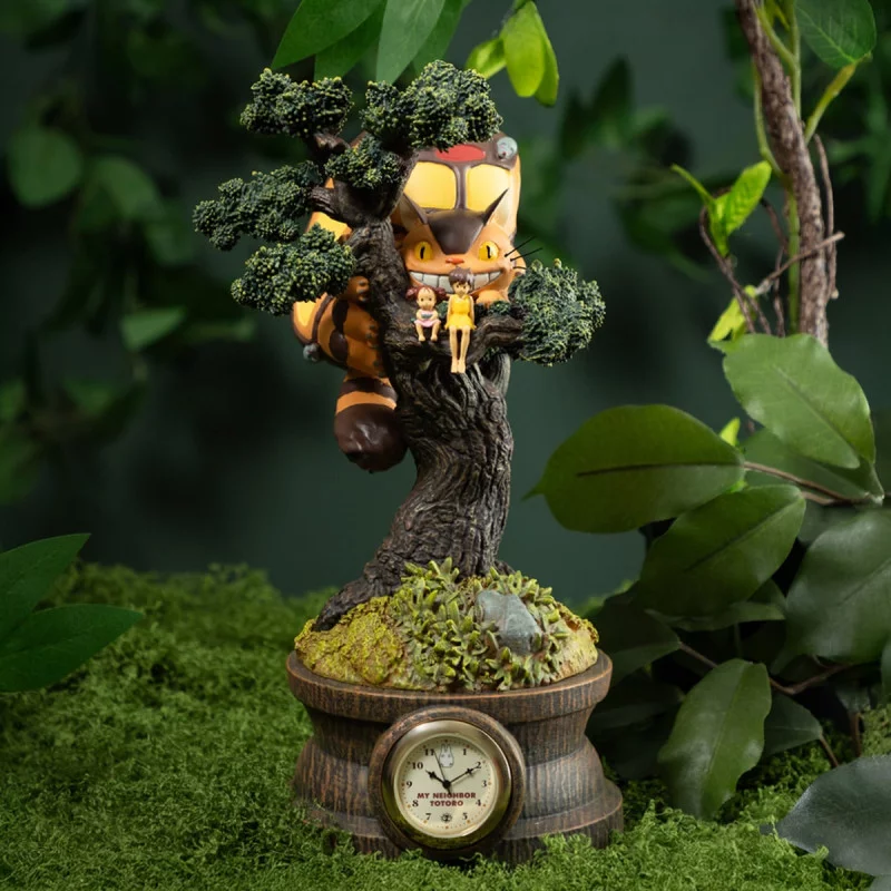 Mei a Satsuki sedící na stromě, ukrytý Chatbus a jemné detaily vytvářejí scénu jako vystřiženou přímo z filmu. Vestavěné hodiny nenápadně doplňují celé diorama a dělají z něj nejen dekoraci, ale i funkční kousek do interiéru.