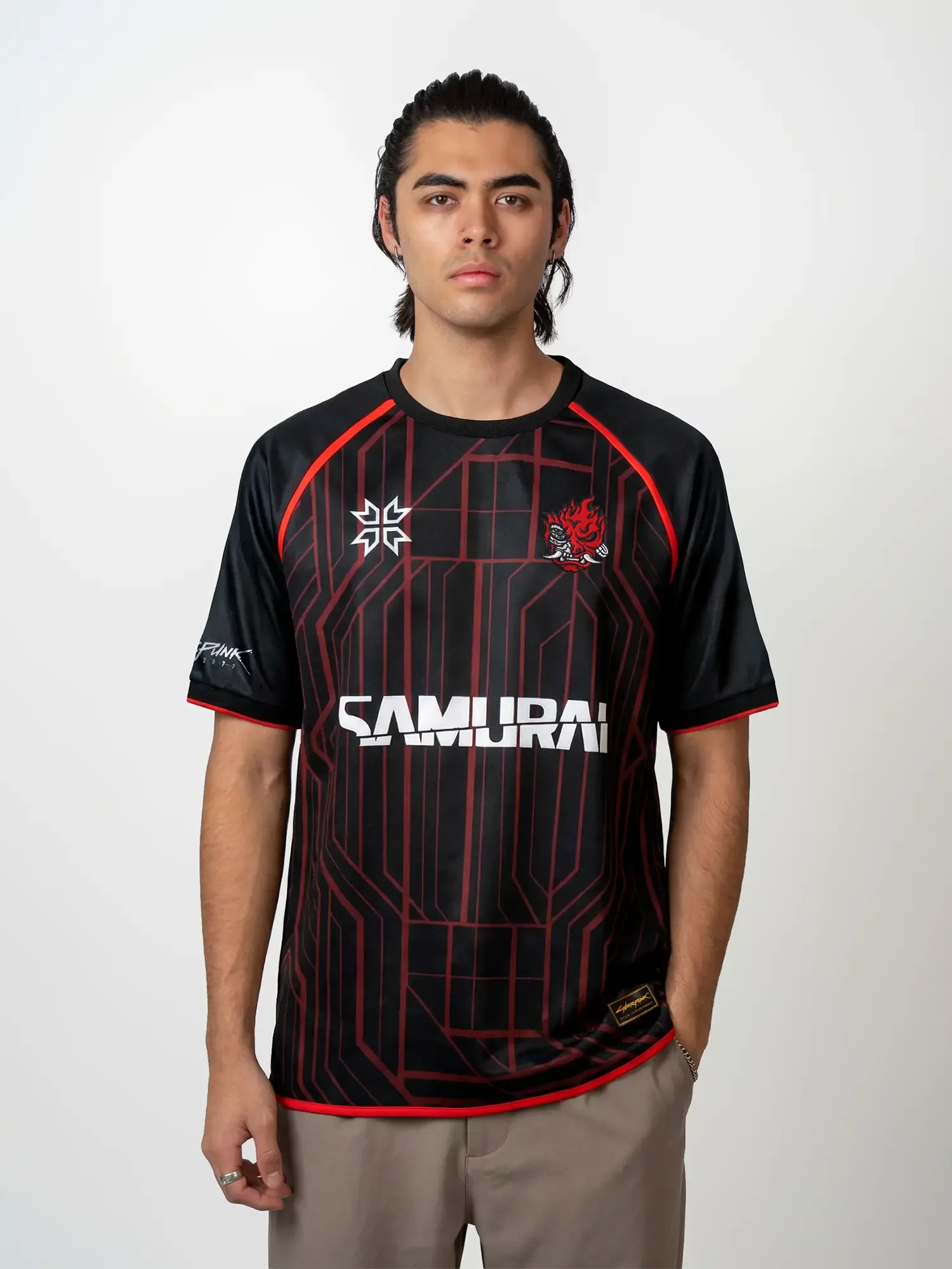 • Vstupte do Night City v barvách legendární kapely Samurai. Dresové tričko inspirované světem Cyberpunk 2077 kombinuje futuristický design s rebelským postojem, který k tomuto univerzu neodmyslitelně patří.