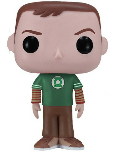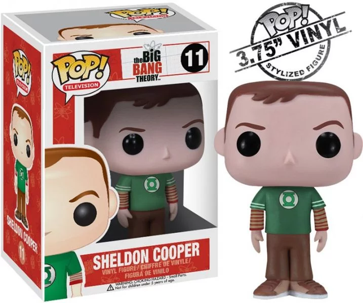 Sheldon v tričku komiksového hrdiny Green LanternFunko Pop! jsou licencované sběratelské kolekce roztomilých figurek k populárním předlohám. Figurky Big Bang Theory zpodobňují známé postavy televizního seriálu Teorie velkého třesku. Figurky edice Pop! jsou přibližně 9 cm (4) vysoké.