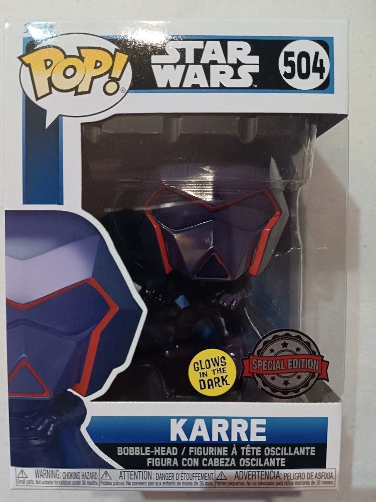 Funko POP! figurka představuje postavu Karre z anime seriálu ze světa Hvězdných válek Star Wars: Visions. Karre, stejně jako jeho sestra Am, byl stvořen za pomoci temné strany Síly a mají za úkol zničit Novou republiku. Figurka svírá v ruce modrý světelný meč, který ve tmě svítí a má kývací hlavu (Bobble-Head).