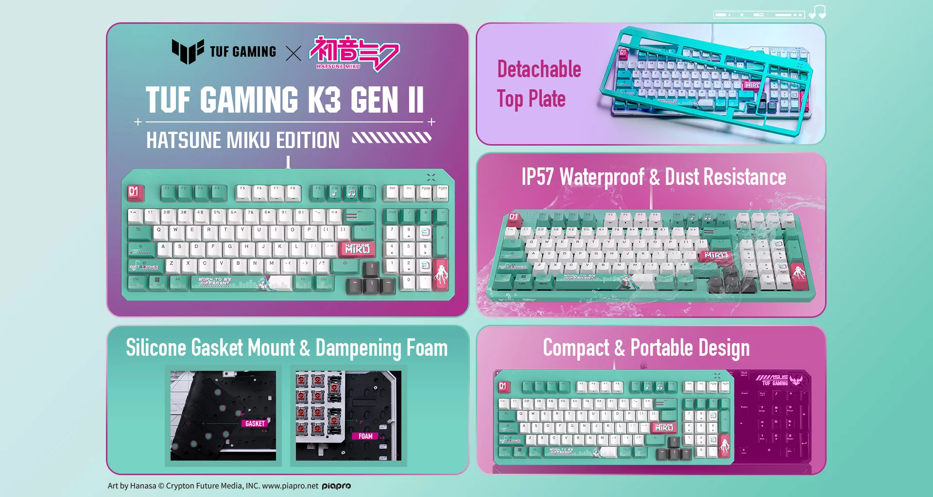 Klávesnice ASUS TUF Gaming K3 Gen II Hatsune Miku Edition s kompaktním 97klávesovým rozložením, opticko-mechanickými RGB spínači, uchycením se silikonovým těsněním, tlumicí pěnou, voděodolností IP57, odnímatelným horním panelem a kompatibilitou s Aura Sync.SPECIFIKACE