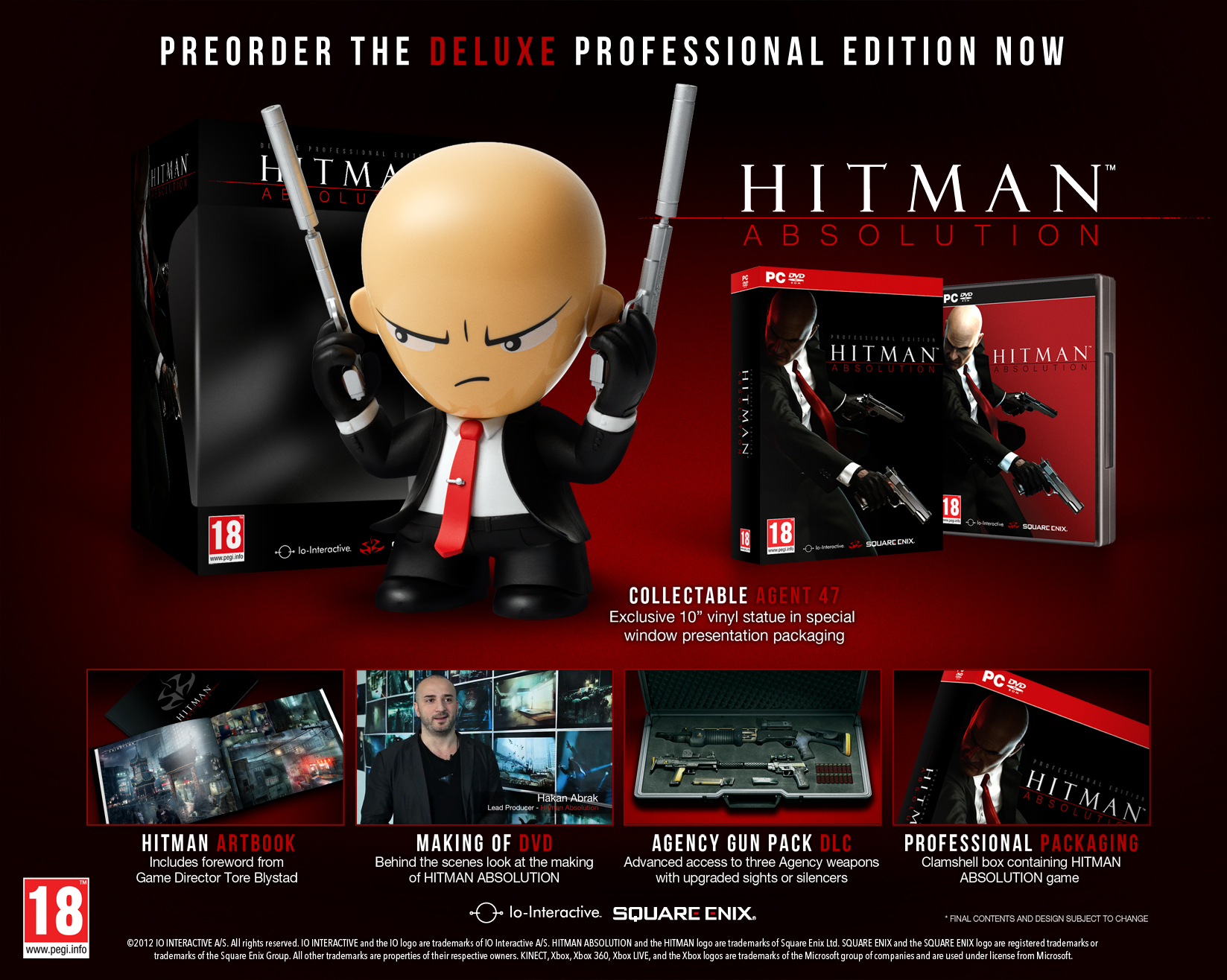 HITMAN: ABSOLUTION popisuje nejosobnější kontrakt, který kdy tento slavný nájemný zabiják přijal. Agenta 47 zradí jeho vlastní organizace, policie mu je na stopě. Podaří se mu zachránit si krk ve světě plném klamu a lží? Podívejte se na svět očima agenta 47. Předvídejte hlídkové trasy nepřátel. Objevte ve svém okolí únikové cesty, použitelné zbraně a zkratky, jež vám dopomohou dostat se k cíli. Pomocí instinktu splyňte s okolím nebo se za někoho vydávejte a projděte nepřátelům přímo pod nosem. A pokud chcete, můžete použít i agresivnější přístup a zaútočit střelbou od boku; tato nová možnost vám zachrání krk, až se dostanete do úzkých a budete potřebovat zlikvidovat větší počet nepřátel najednou.Edice obsahuje hru ve speciálním balení, Figurku Agenta 47, Art Book, DVD o tvorbě hry, in-game bonus Agency Jagd P22G, Agency HX UMP a Agency SPS 12, vybavení které potřebuje každý profesionál. Obrázek bonusu zde.