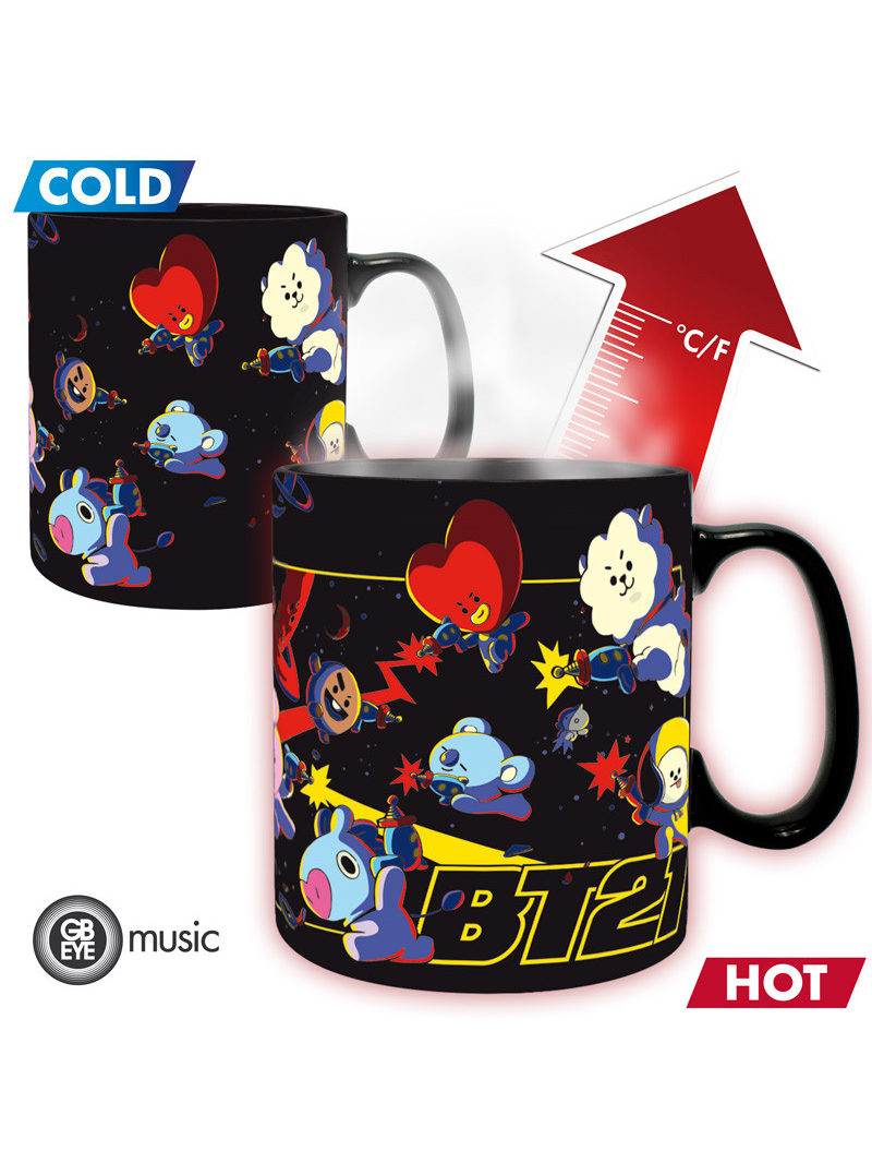Obří hrnek BT21 - Space XL okouzlí nejen svým vesmírným motivem, ale i magickým efektem – po nalití horkého nápoje se jeho design promění! Ideální dárek pro fanoušky BT21, kteří chtějí začít den s hravou dávkou překvapení.Objem: cca 460 ml