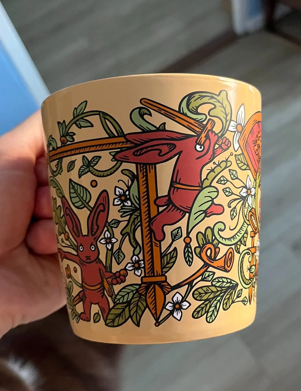 Roztomilí, ale ozbrojení. Oblíbení zajíci ukrytí v rozkvetlém hvozdu dohlédnou na to, aby váš nápoj nebyl zcizen žádným lotrem. Velký keramický hrnek s objemem 500 ml pojme pořádnou porci čaje i kávového odvaru proti vyčerpání. Na dně pak najdete oficiální logo Kingdom Come: Deliverance II.