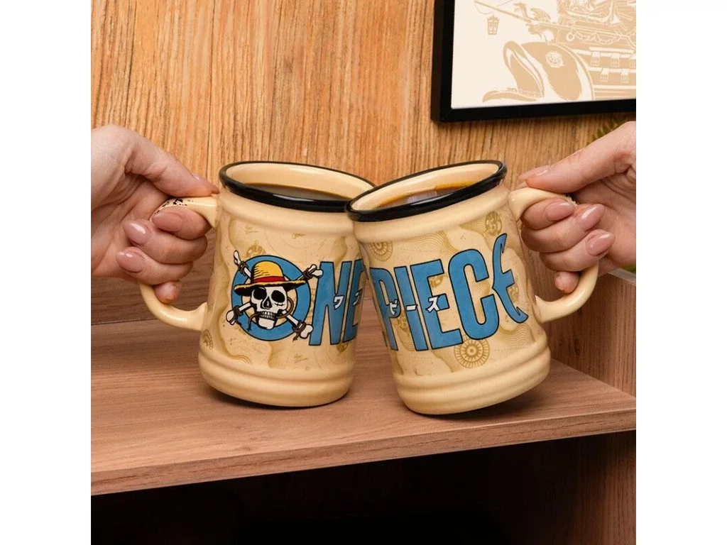 Hrnek One Piece s ikonickým logem a lebkou se slamákem potěší všechny fanoušky Luffyho a jeho posádky. Stylový keramický design s jemným mapovým vzorem na pozadí dodává hrnku jedinečný pirátský nádech.
