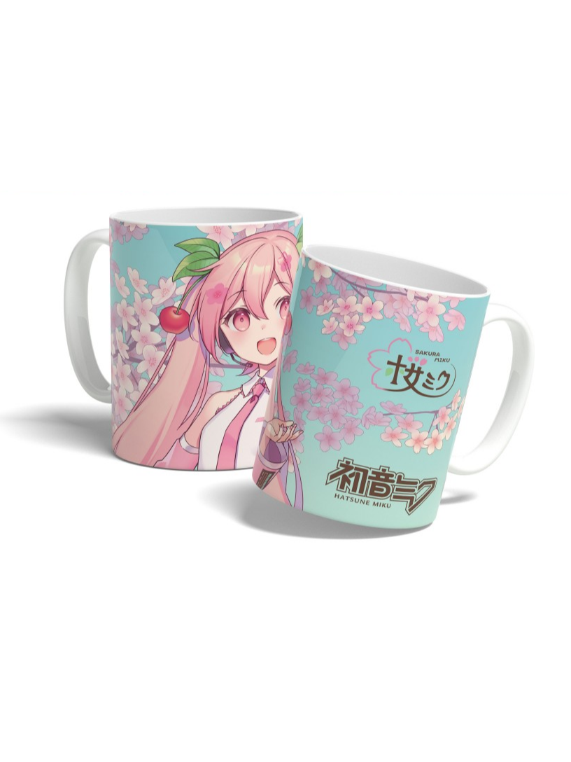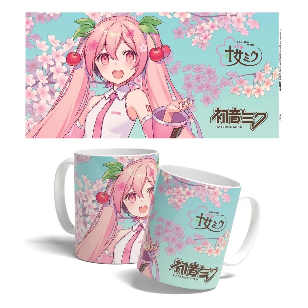 Keramický hrnek s motivem Sakura Miku v květinovém designu sakur, ideální pro milovníky Vocaloid a jarní atmosféry.