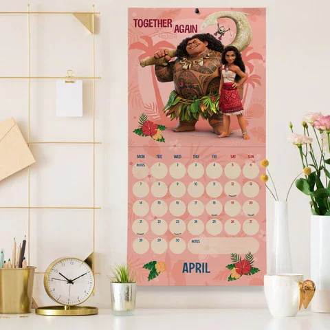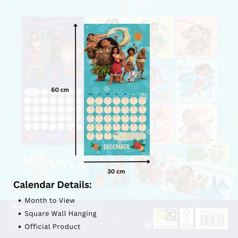 Čtvercový kalendář Moana 2 2025. Každý měsíc zobrazuje obrázky postav a poskytuje dostatek prostoru pro zapsání všech důležitých dat do velkých datových polí.