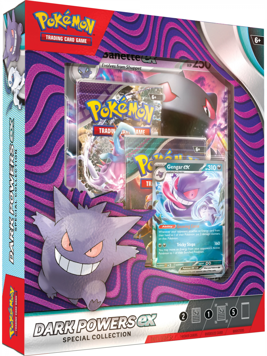 Absol ex a Gengar ex se pyšní velkým HP a silnými útoky a přinášejí do tvého balíčku záludné triky typu Darkness, zatímco strašidelný Banette ex předvádí své schopnosti typu Psychic jako oversized foilová karta pro vystavení.