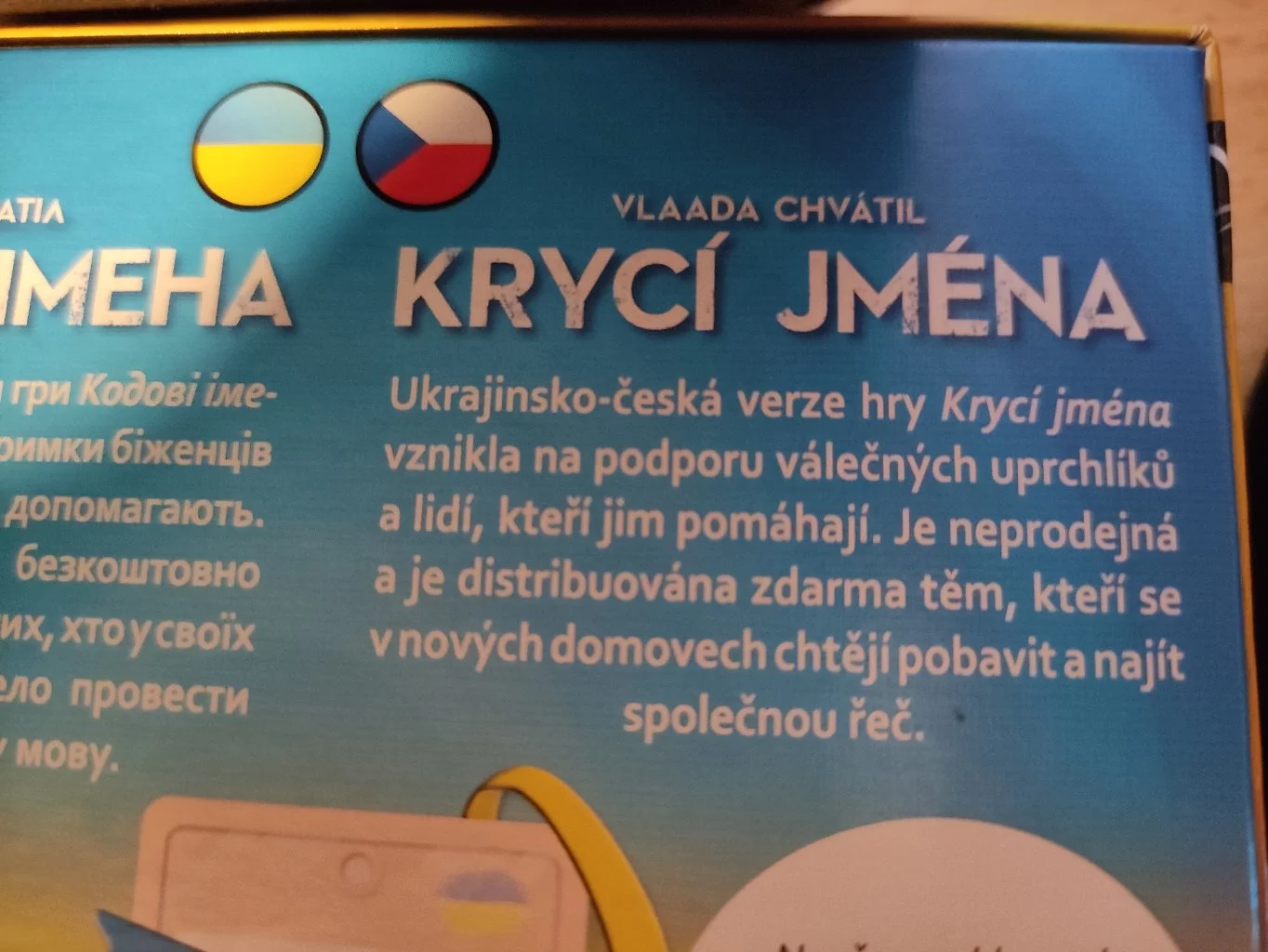 Vydavatelství Czech Games Edition připravilo dvojjazyčnou ukrajinsko-českou verzi populární party hry Krycí jména a zcela ZDARMA ji poskytuje válečným uprchlíkům z Ukrajiny, příp. českým a smíšeným rodinám, které v této situaci nabízí pomoc.