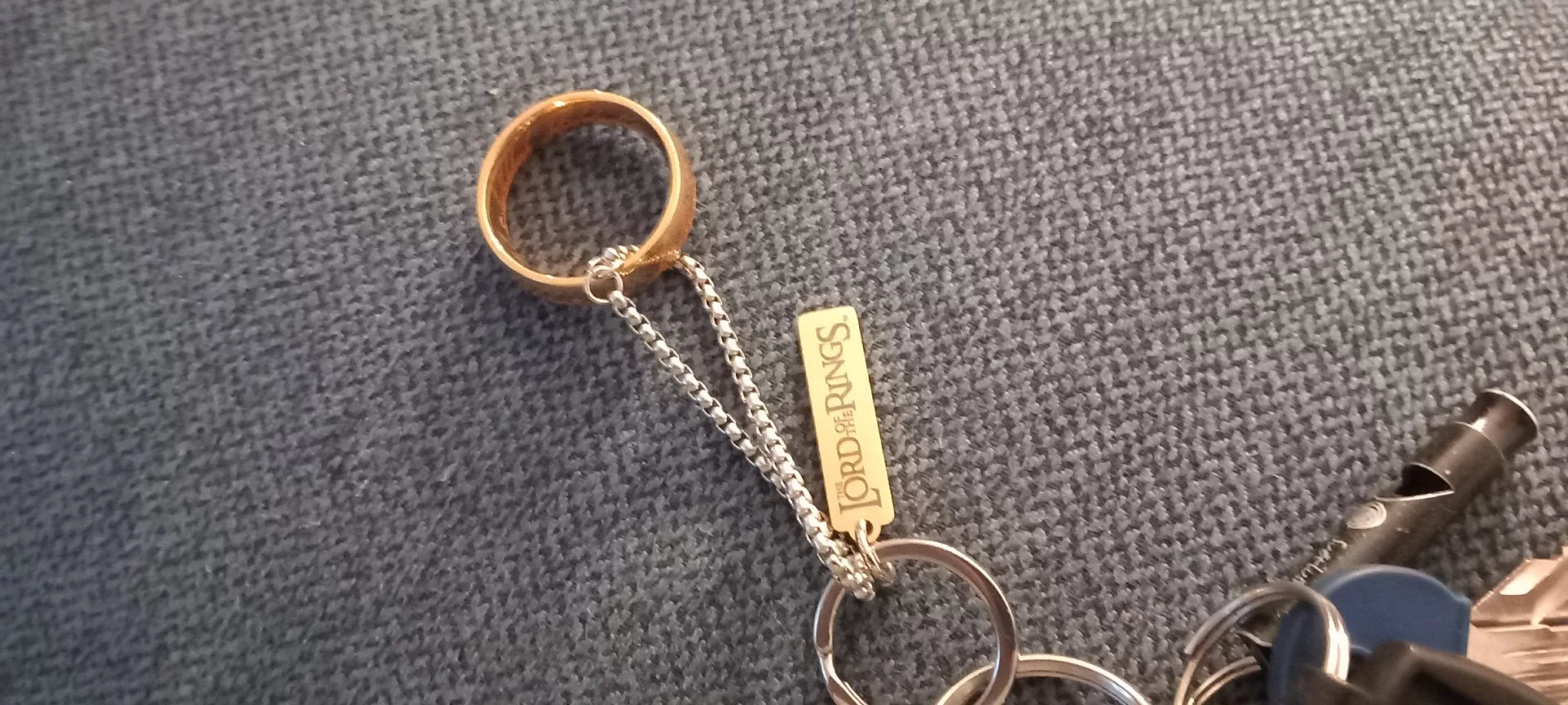 Stylový prsten, z oblíbené filmové série Pán prstenů, s fosforeskujícím nápisem, který po nasvícení září ve tmě. Hodí se na klíče i batoh.