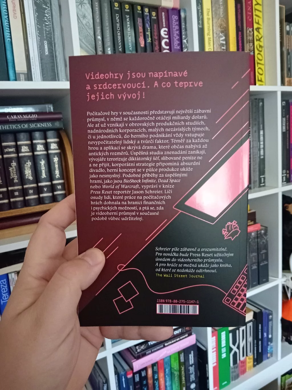 Úspěšná studia znenadání zanikají, vývojáře terorizuje diktátorský šéf, slibované peníze ne a ne přijít, korporátní strategie připomíná absurdní divadlo, herní koncept se v půlce produkce ukáže jako nesmyslný. Podobné příběhy za úspěšnými hrami, jako jsou Bioshock Infinite, Dead Space nebo World of Warcraft, vypráví v knize Press Reset reportér Jason Schreier. Líčí osudy lidí, které práce na počítačových hrách dohnala na hranici finančních i psychických možností, a ptá se, zda je videoherní průmysl v současné podobě vůbec udržitelný.
