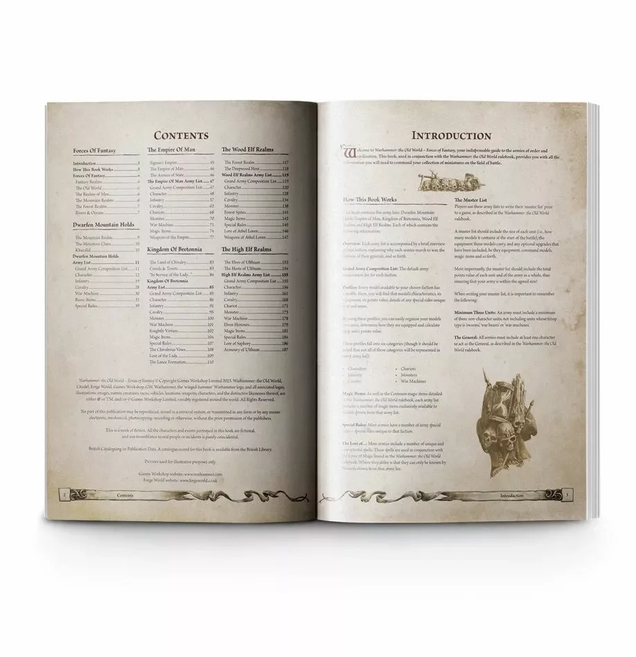 Uvnitř této 192stránkové knihy v pevné vazbě najdete army list obsahující profily a speciální pravidla pro frakce Dwarfen Mountain Holds, Empire of Man, Kingdom of Bretonnia, Wood Elf Realms a High Elf Realms spolu s magickými předměty a jedinečnými kouzly.