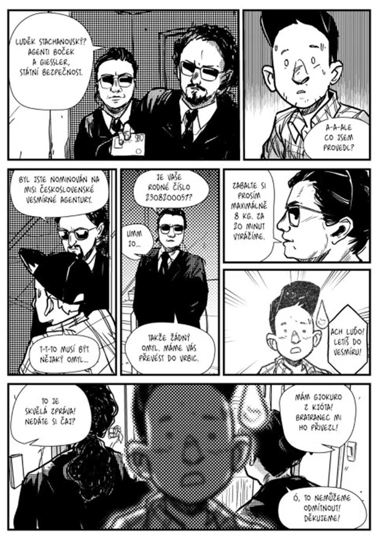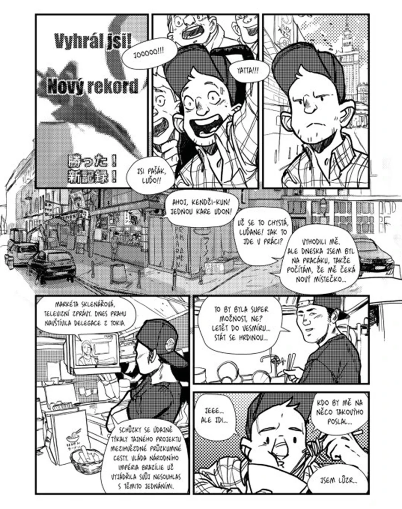 Nacházíme se v roce 2046 v Československu, kde přetrvala ČSSR, která se reformovala po vzoru Číny. Po rozpadu SSSR otevřela země svůj trh mnoha japonským firmám, aby získala kapitál. Z této spolupráce povstal společný vesmírný program Československa a Japonska a vytvoření experimentálního motoru schopného zakřivit časoprostor. Na lodi vybavené tímto pokročilým motorem cestuje Luďa Stachanovský. Je nulou bez životních perspektiv, který tráví většinu času hraním na automatech. Zároveň je ale vnukem slavného Luďka, budovatele ČSSR. Luďa cítí tlak na to, aby uskutečnil velký sen svého dědy a dosáhl něčeho významného.Počet stran: 100