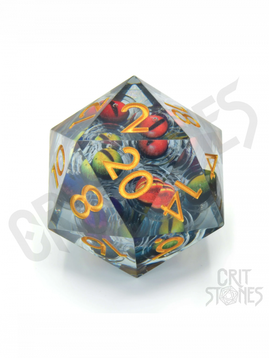 Obří D20 kostka Beholden - Floating Eyes ukrývá v průzračném těle plovoucí oči, které sledují každý tvůj hod. Zlatooraná čísla kontrastují s temným vnitřkem a dodávají jí zlověstný, hypnotický vzhled.
