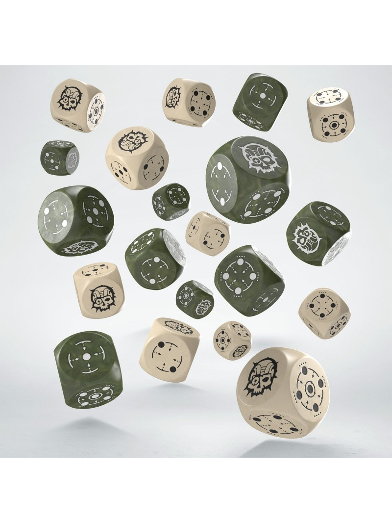 Sada 20 kompaktních kostek v béžové a olivové barvě s unikátním terčovým designem pro rychlé a přehledné hody.