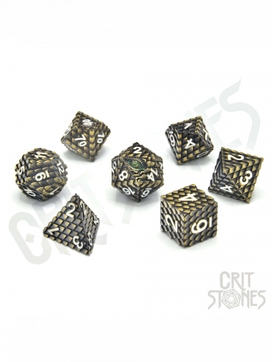 Sada Drudaxizius Metal vypadá, jako by ji střežil sám prastarý drak. Kovové kostky s reliéfem dračích šupin a očima plnými moci dodají každému hodu epický rozměr.