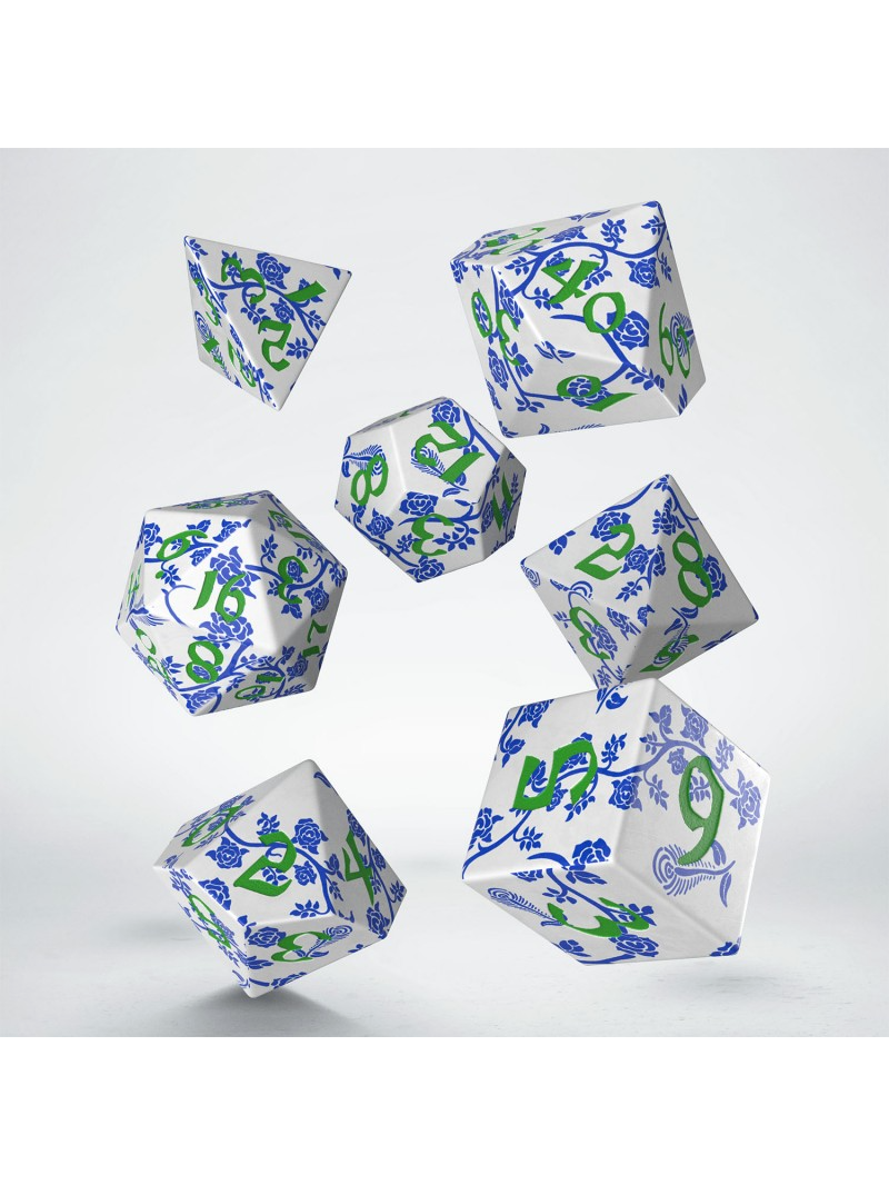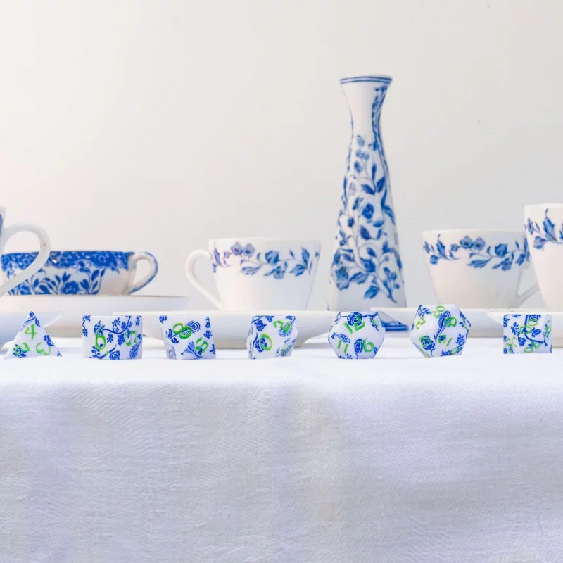 Elegantní sada inspirovaná porcelánem. Každá kostka je celoplošně zdobená jemnými modrými ornamenty a výraznými zelenými čísly.