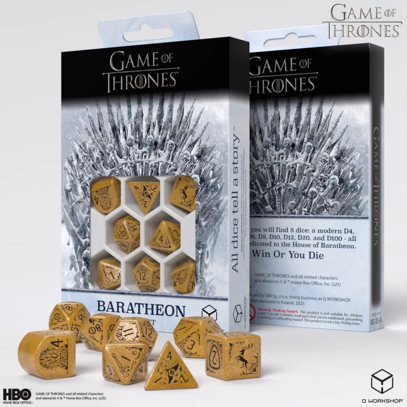 Zahrajte si s majestátní silou rodu Baratheonů. Osmidílný set kostek v královské zlaté barvě zdobí emblém jelena a elegantní detaily, které podtrhnou odkaz vládnoucího rodu bouře.
