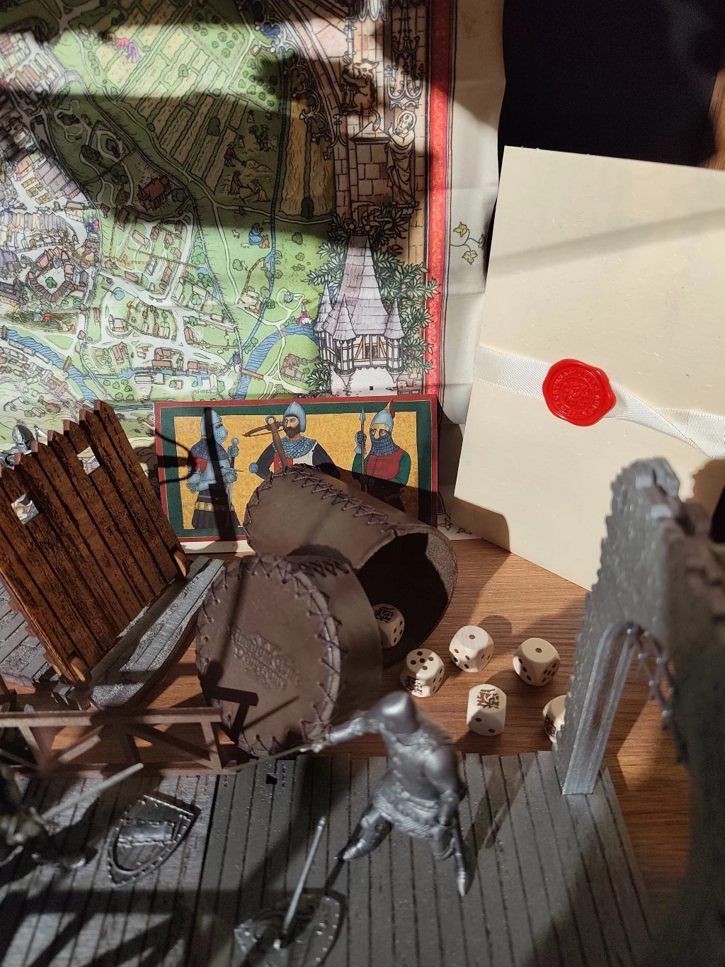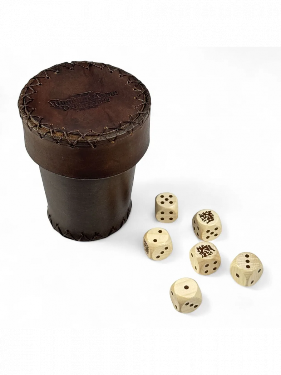 Stylový kožený kalíšek s víkem a sada šesti dřevěných kostek s logem Warhorse Studios – ideální společník pro chvíle oddechu u ohně, na cestách i v hospodě. Ručně vyráběno z poctivé hovězí kůže v srdci českých zemí, tato sada v sobě spojuje řemeslnou kvalitu a středověkou atmosféru.