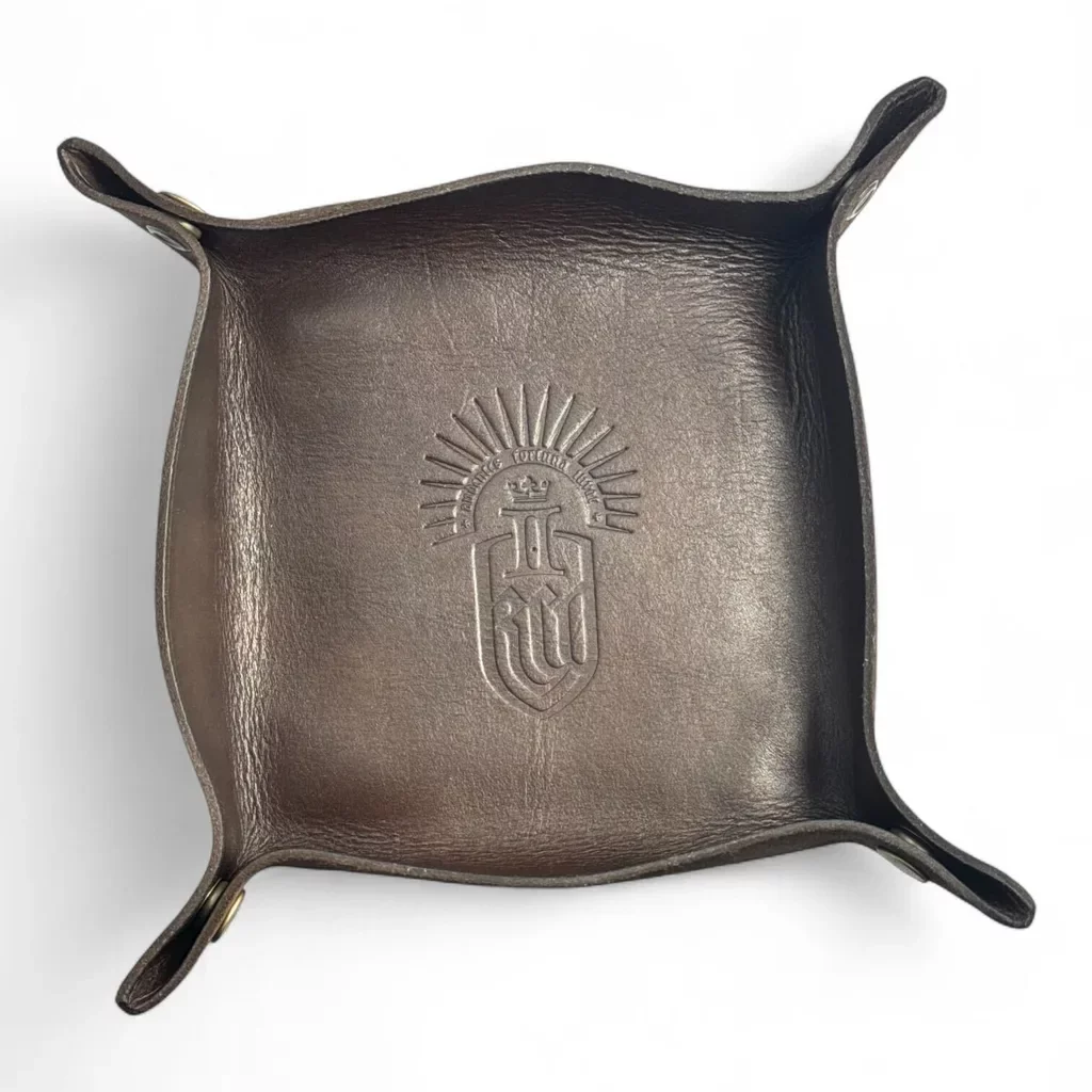 Kožený kalíšek a hrací kostky v setu s tácem na kostky (dice tray), které zpříjemní každý večer s přáteli u táborového ohně.