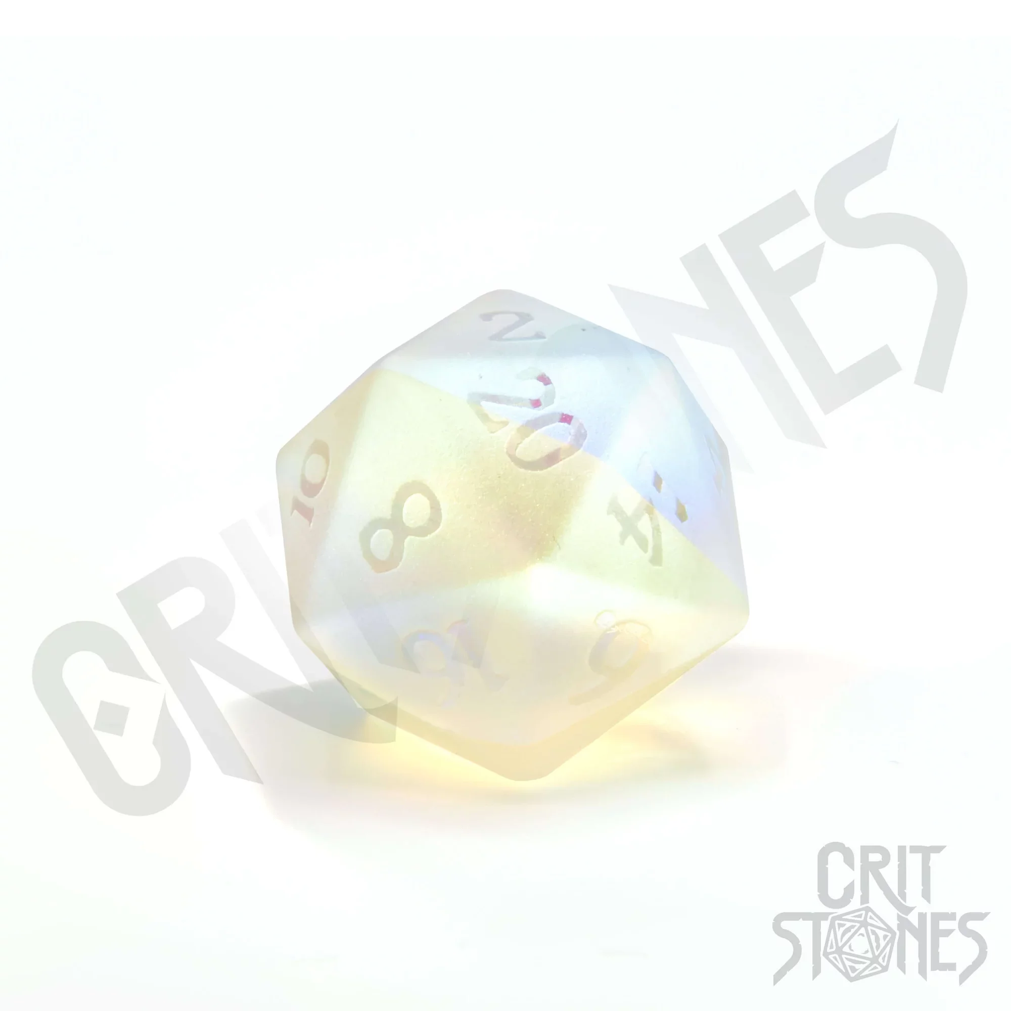 Sada Prismatic Frost Glass okouzlí svým duhovým odleskem a mléčně průsvitným povrchem, který připomíná zmrzlý krystal. Každá kostka vypadá jako artefakt ze světa věčného chladu – jemná na pohled, ale neúprosná při hodech.