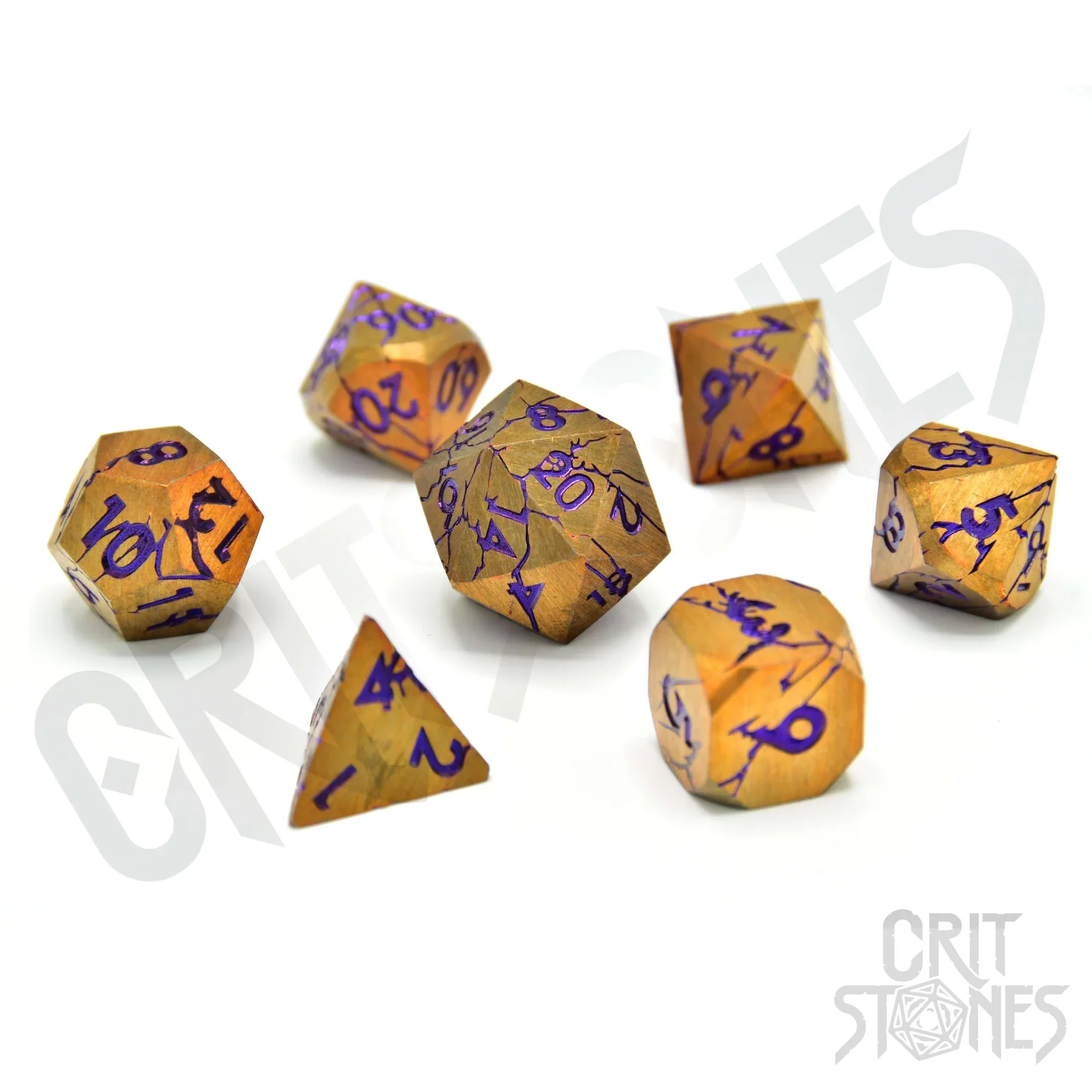 Sada Shattered Sigils Metal září zlatavým povrchem s fialovým písmem a mystickými symboly, které vypadají jako ztracené runy dávných čarodějů. Každá kostka působí jako artefakt s vlastní mocí.
