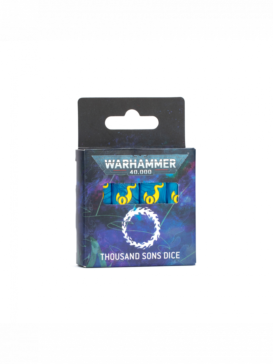 Sada šestistěnných kostek pro stolní hru Warhammer 40 000. (šestka je nahrazena Thousand Sons ikonou).