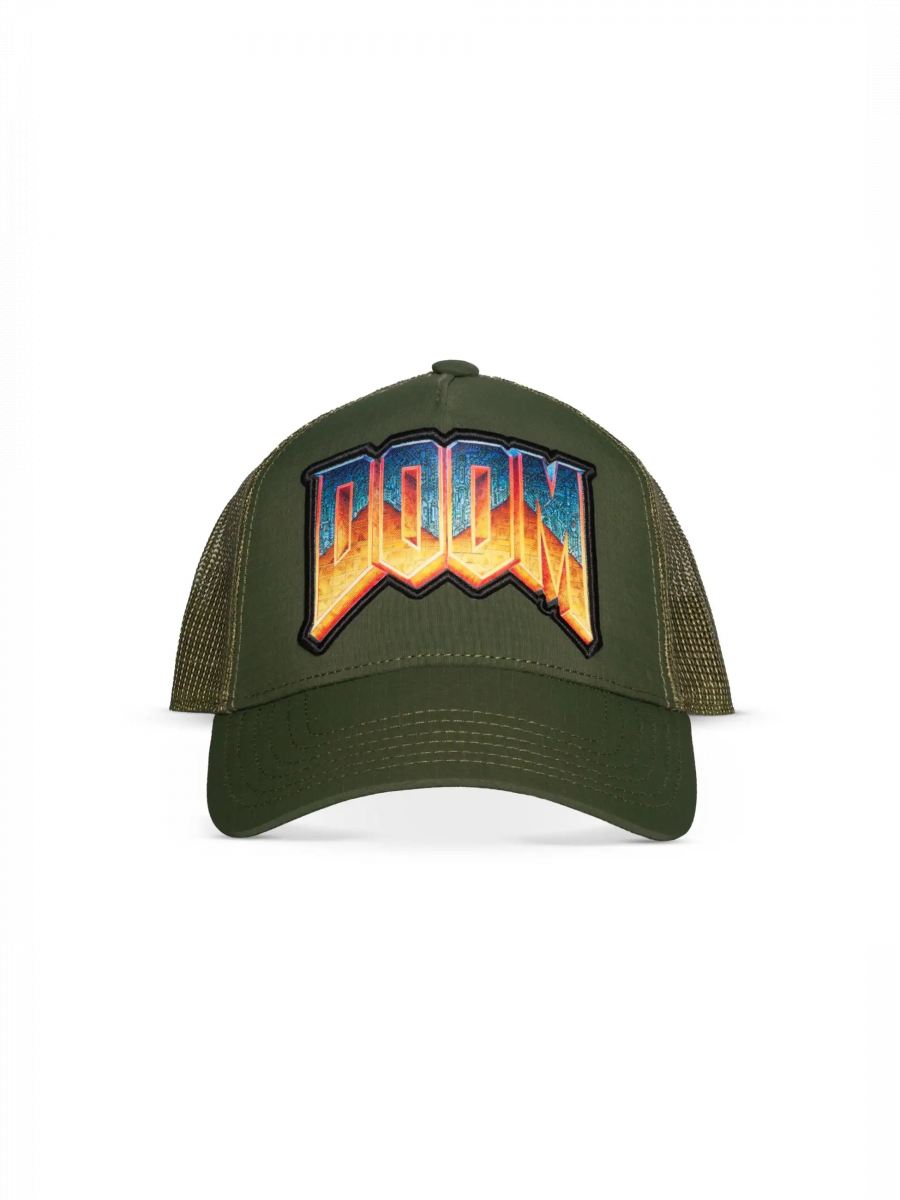 Připravte se na démony i letní vedro. Tahle olivově zelená truckerka s masivním logem DOOM je ultimátní doplněk pro každého Slayera.