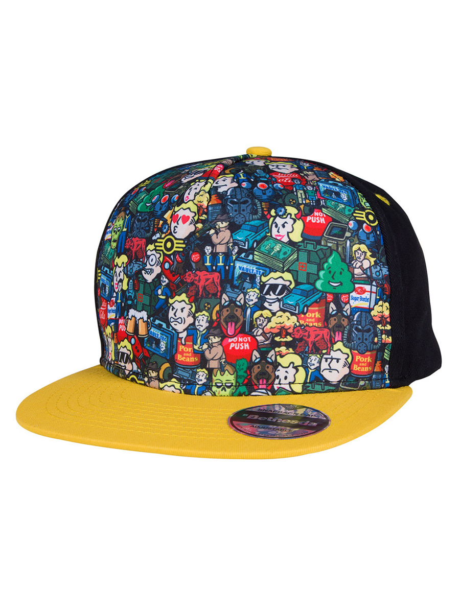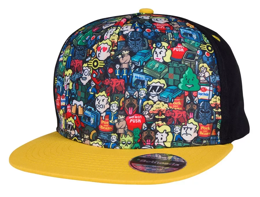 Kšiltovka s rovným kšiltem (Snapback) a kompletní sadou emoji obrázků včetně dobře známého Pip-Boye kultovní počítačové hry Fallout 76 od vydavatele Bethesda.