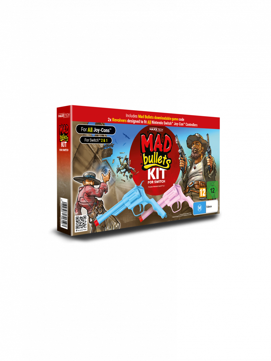 Nová sada Mad Bullets Kit pro Nintendo Switch 2 a 1 obsahuje dva revolvery navržené pro ovladače Joy-Con Nintendo Switch 2 a 1 a digitální kód ke stažení hry Mad Bullets.