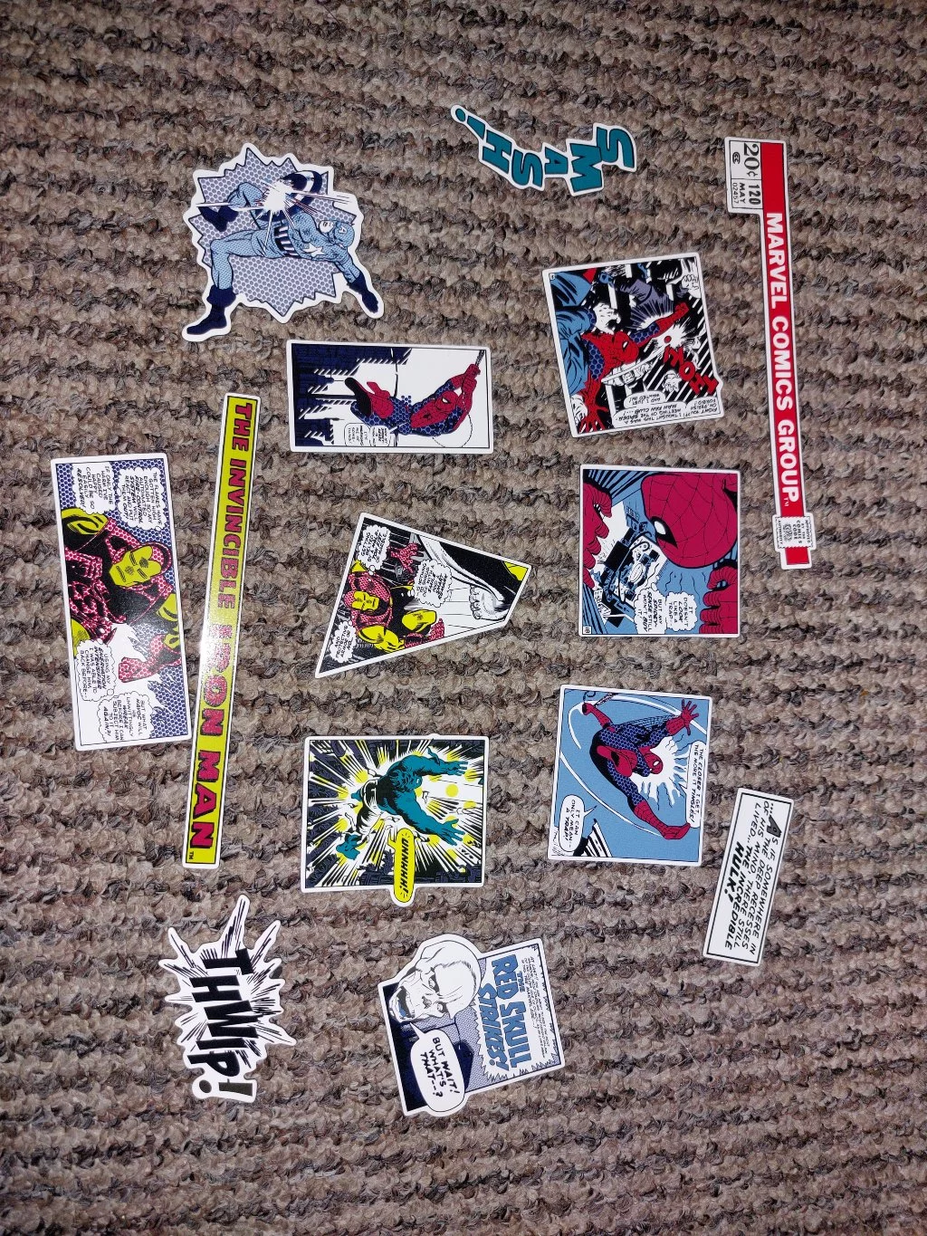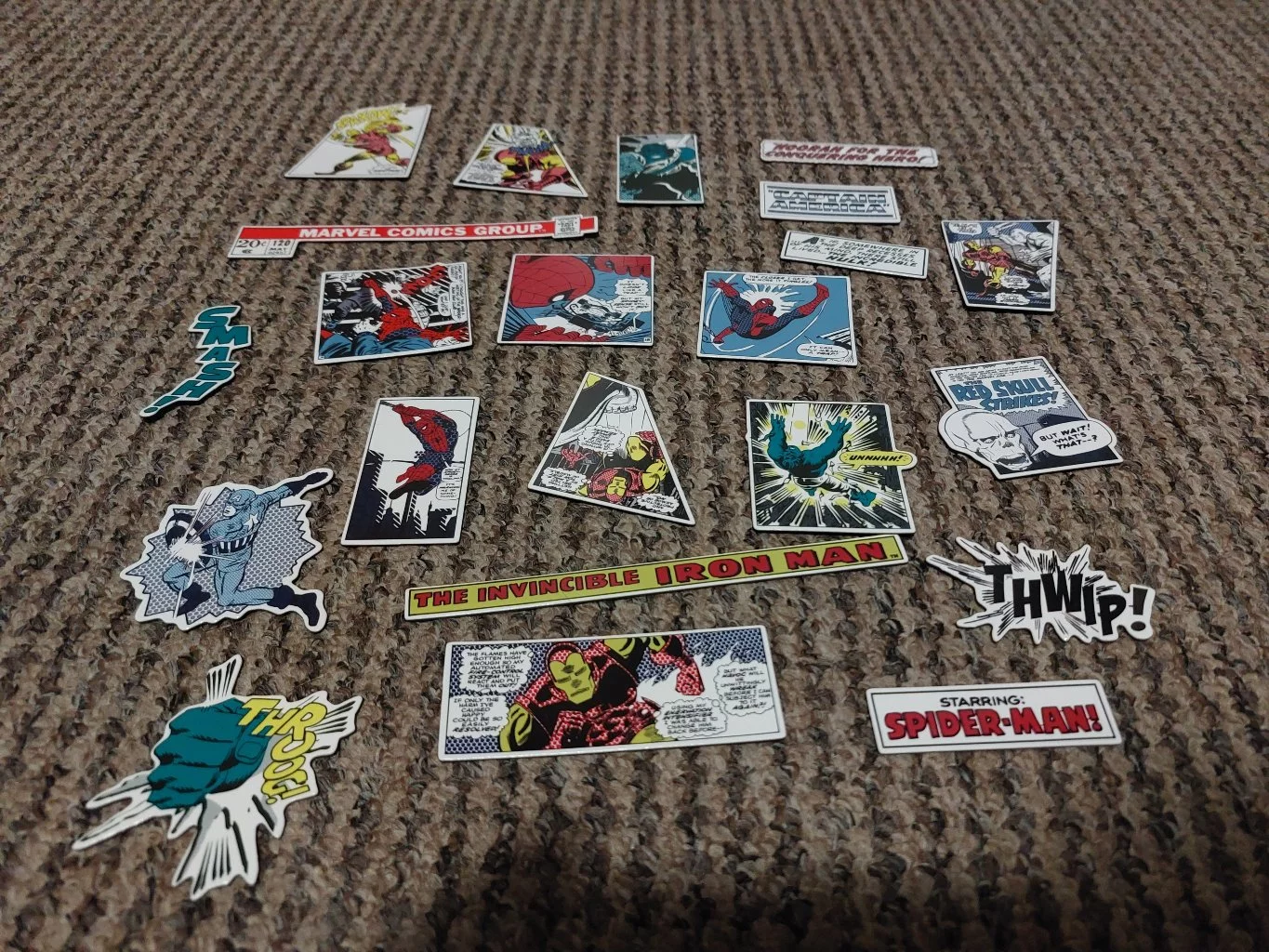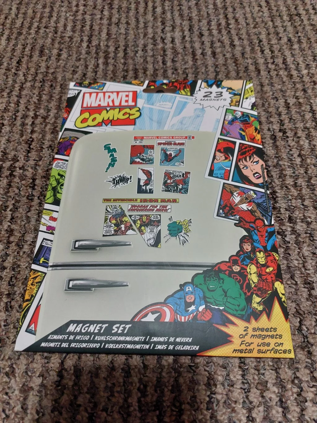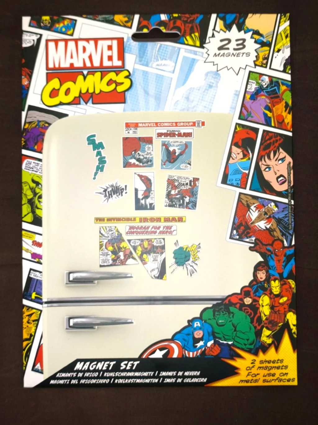 Tato sada 23 ks magnetek v komiksovém zpracování vyobrazuje pár základních postav od Marvelu jako jsou Spiderman Iron Man nebo Kapitán Amerika a doplňuje je o komiksové textové části. Všechen text je v angličtině.