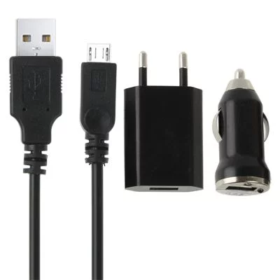 Nabíjecí sada pro mobilní telefony s Micro USB konektorem obsahuje nabíjecí kabel, zástrčku do zásuvky a adaptér pro nabíjení v autě.