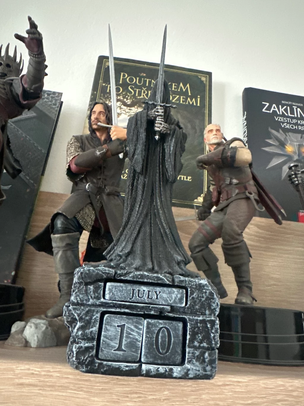 Nekonečný kalendář s motivem Nazgûla z filmové série Lord of the Rings. Kalendář je vyrobený z pryskyřice a ručně malovaný. Obsahuje 5 bloků s dny a měsíci, díky kterým lze nastavit každý den v roce.