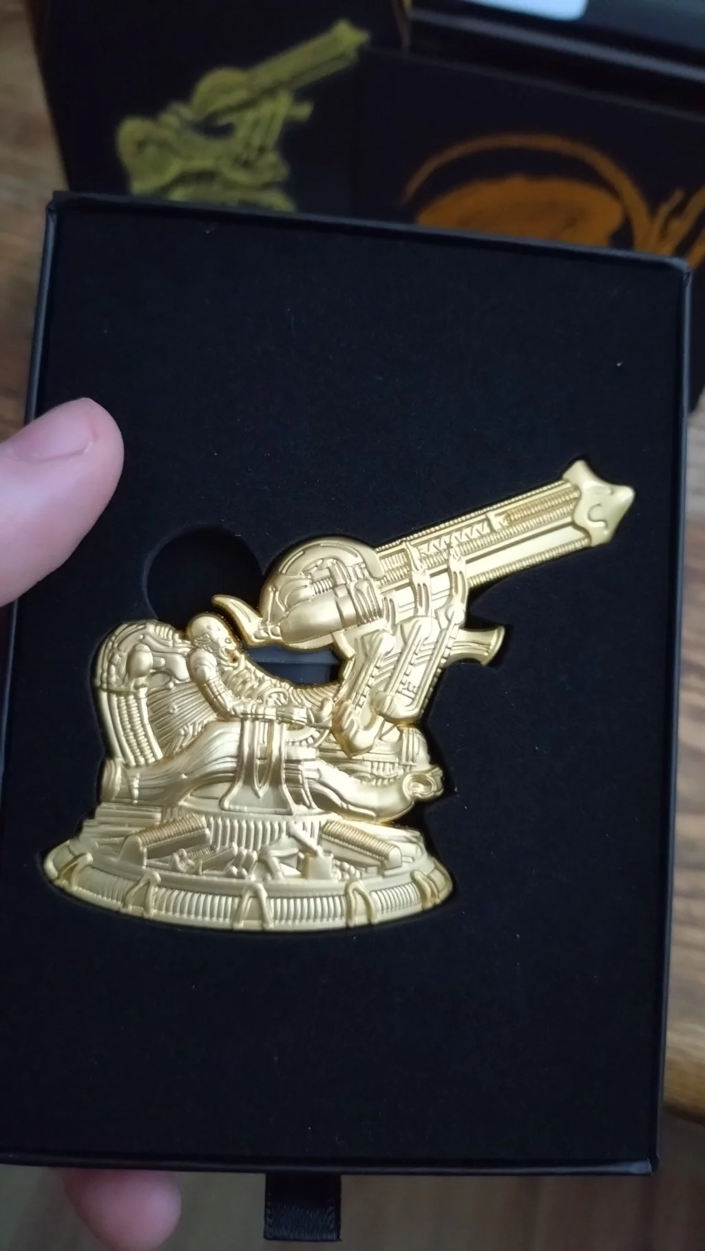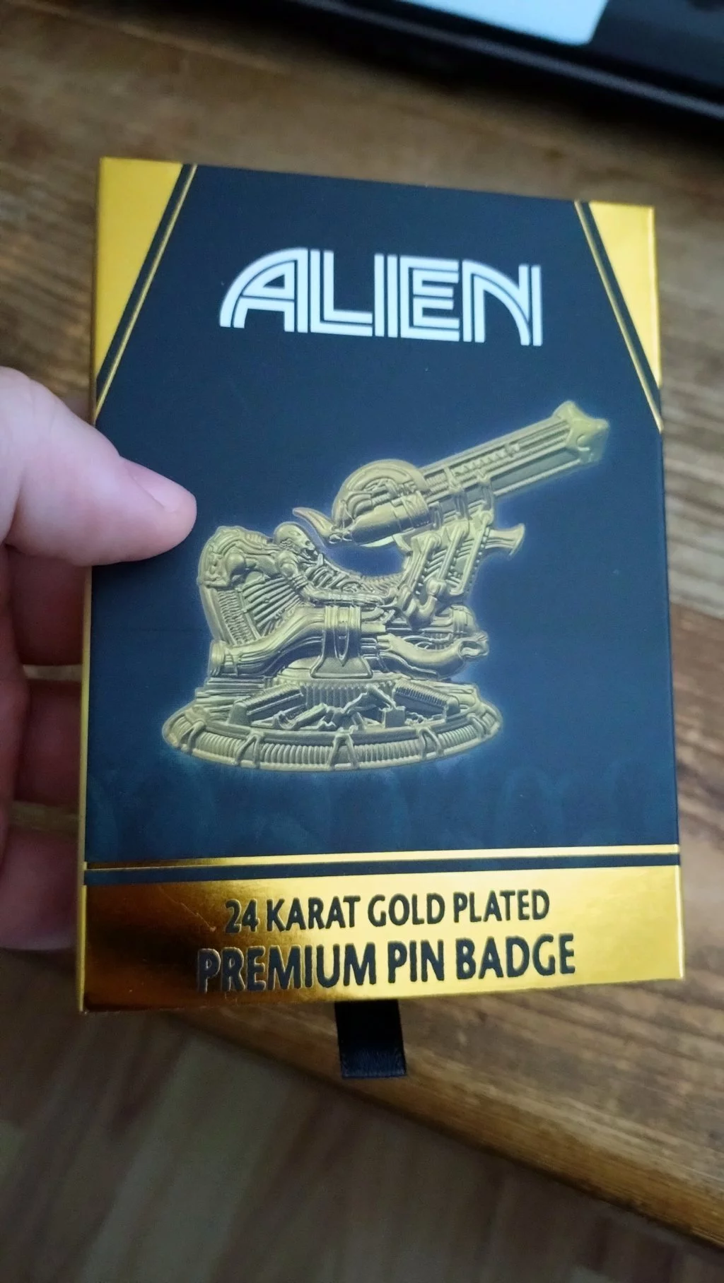 Krásne spracovaný odznak. Ktorý je síce moc veľký na nosenie ale kto by nosil pozlátený limitovaný odznak. Ešte by som ho niekde stratil. Aj tak je to iba na výstavu. Potešilo že obsahuje fakt krásnu litografiu so zlatým votrelcom.