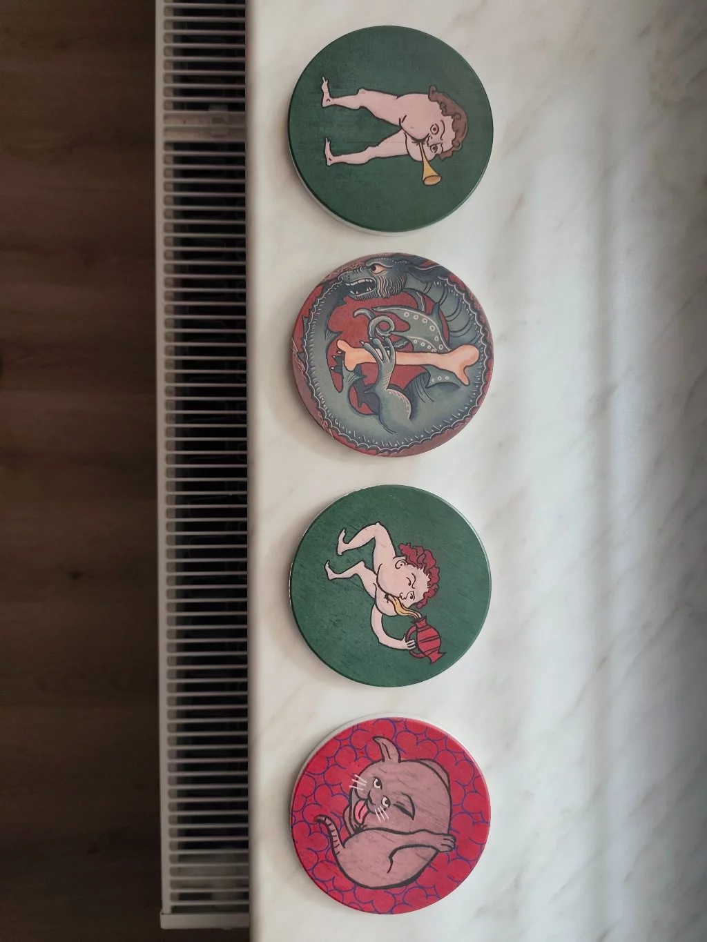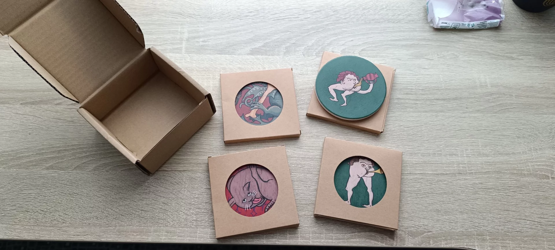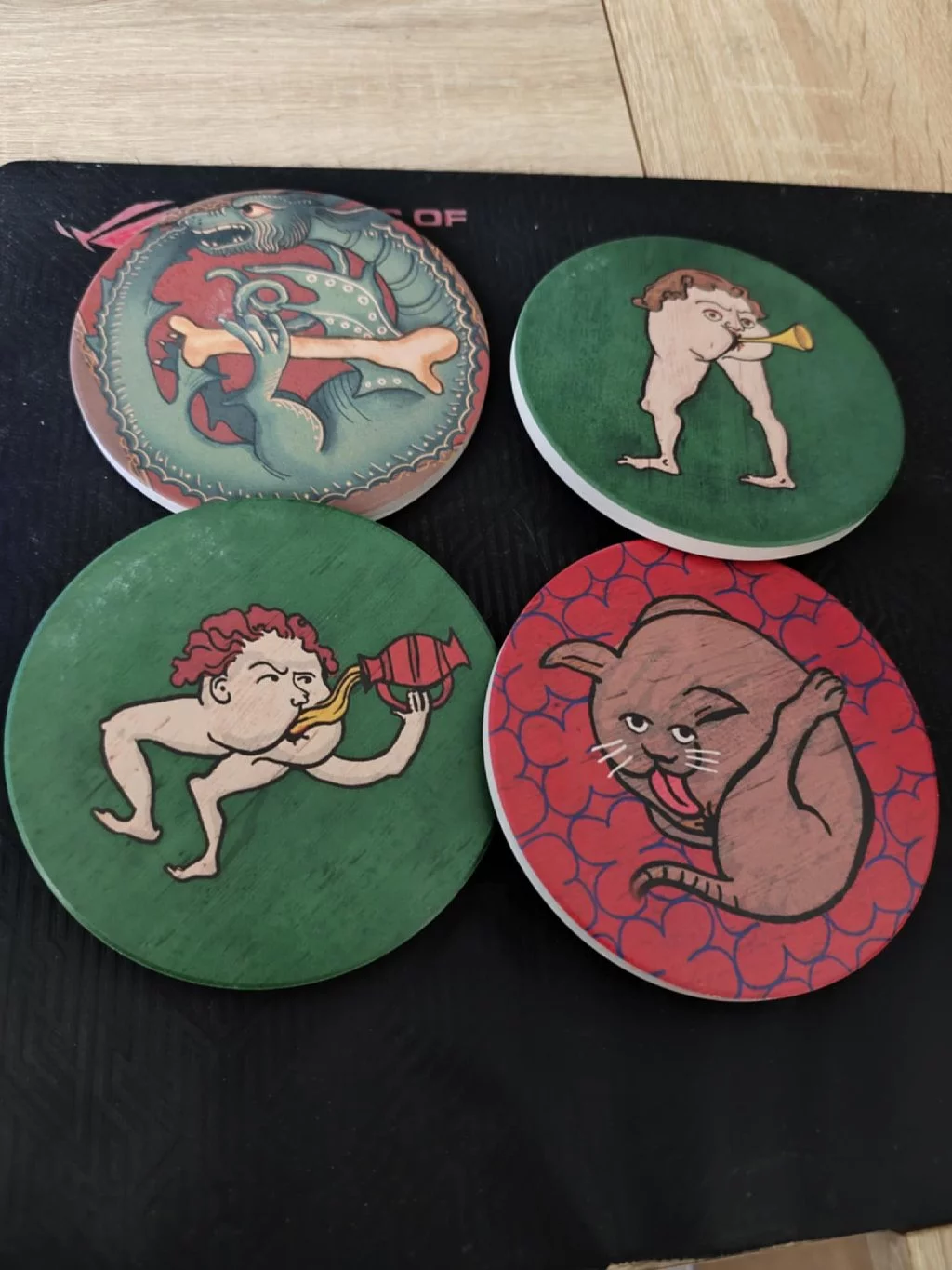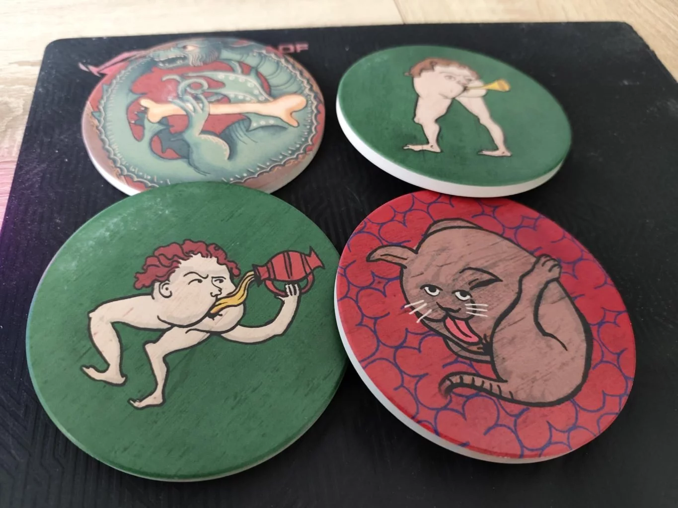 Středověká moudrost praví: „Kdo pije bez podtácku, ten si koleduje o lepru… nebo aspoň mokrý stůl.“ Tyto keramické podtácky s korkovým základem přinášejí to nejlepší z bizarních historických iluminací v českém hitu Kingdom Come: Deliverance II – od absurdních kreatur po výjevy, které by si zasloužily vlastní kapitolu v kodexu šílenství. Ať už jste pán hradu, nebo jen skromný hospodský kumpán, s těmito podtácky udržíte svůj stůl v suchu a své pití ve správně středověké atmosféře.