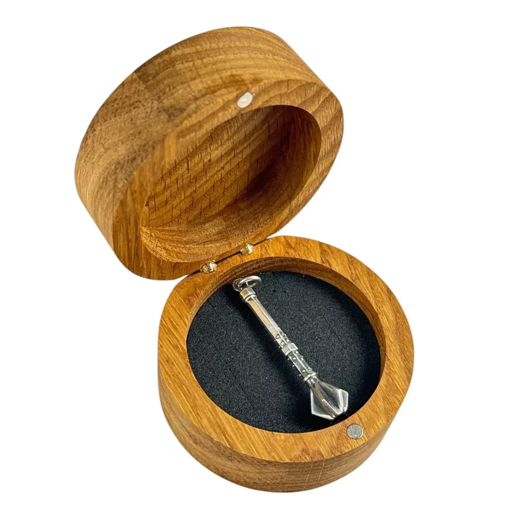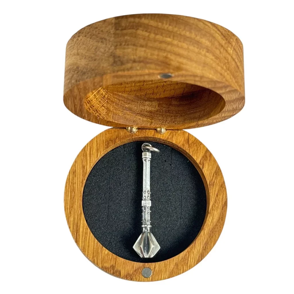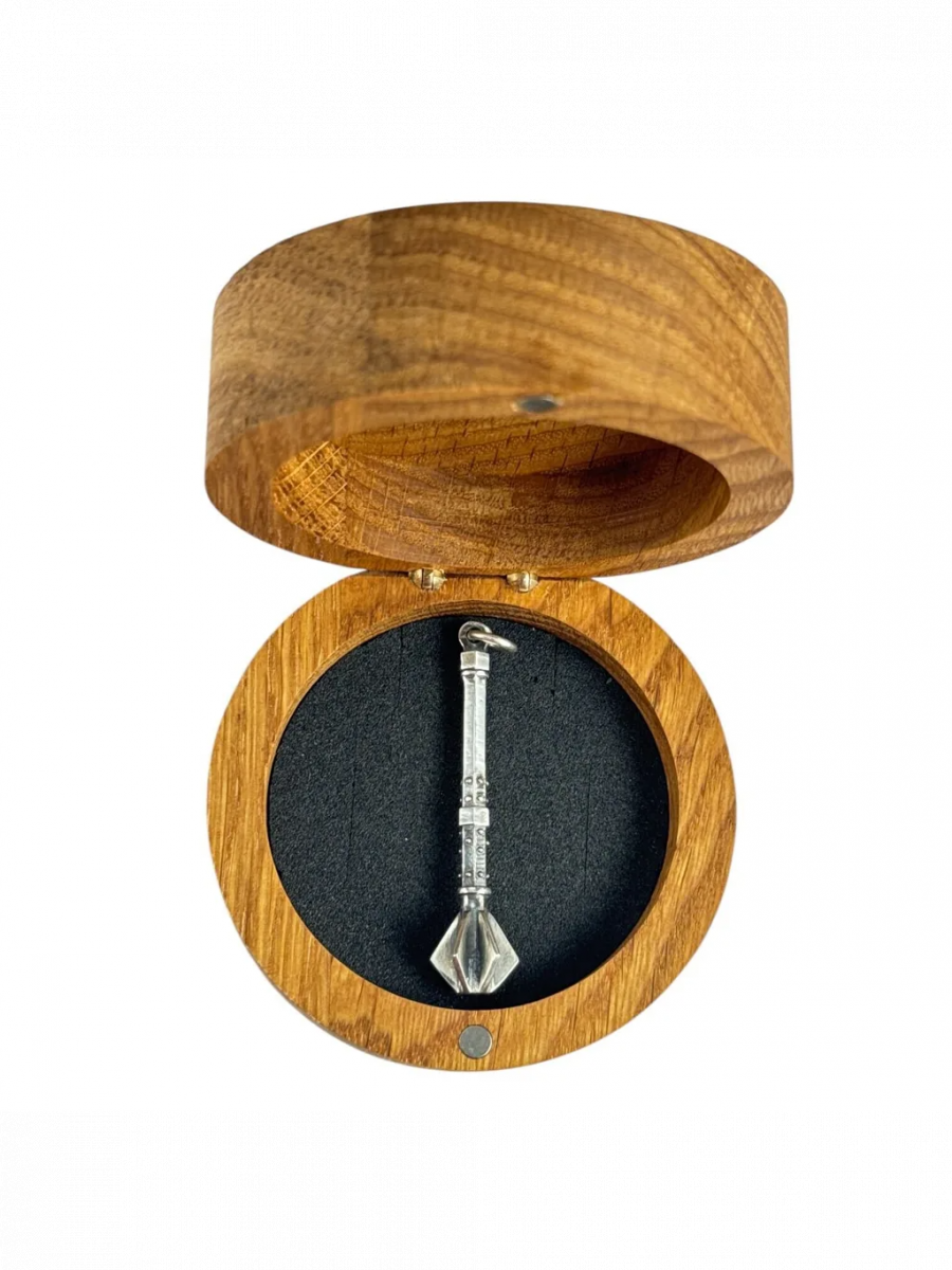 Stříbrný přívěsek - Žižkův palcát ze hry Kingdom Come: Deliverance II. Součástí je i velmi originální dubová krabička na šperky s vypáleným logem hry, která společně s miniaturou palcátu tvoří jedinečný herní merch.