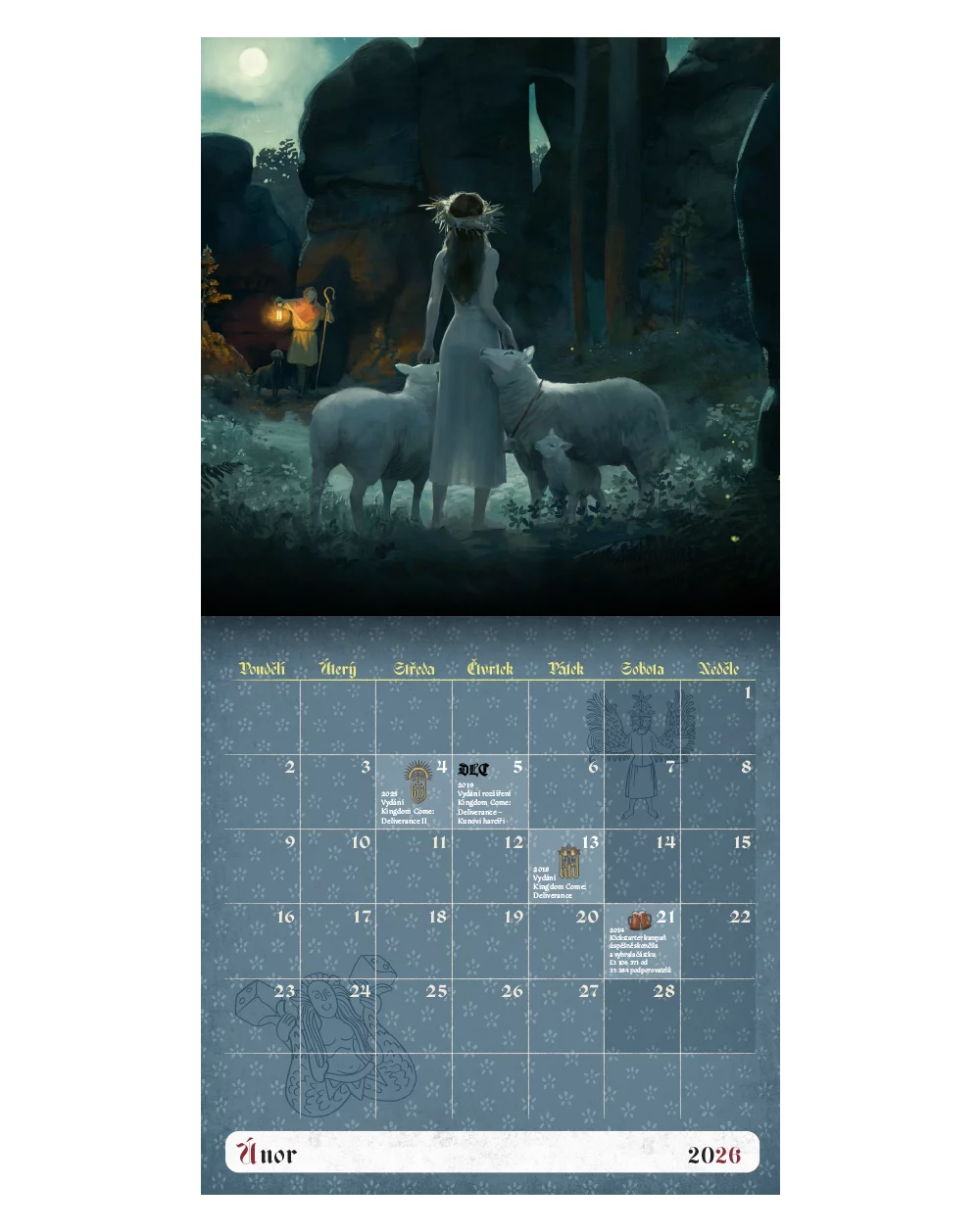 Užijte si celý rok ve společnosti Kingdom Come: Deliverance II. Každý měsíc zdobí nádherné ilustrace ze hry, které zachycují atmosféru příběhu Jindřicha i krásu historických míst od Kutné Hory po české hrady a vesnice.