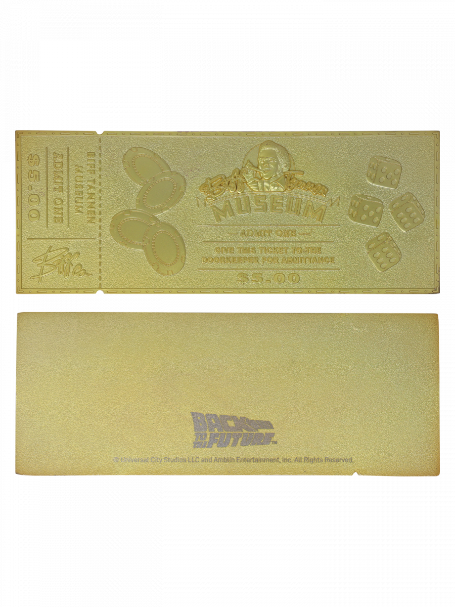 Luxusní replika vstupenky do Biff Tannen Museum potěší každého fanouška budoucnosti i alternativních časových linií. Limitovaná edice s pozlacením 24 karáty připomíná ikonický moment z druhého filmu a nabízí skutečně sběratelský zážitek.