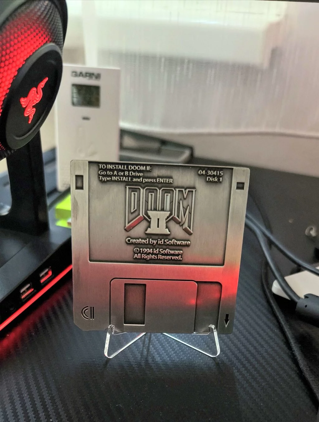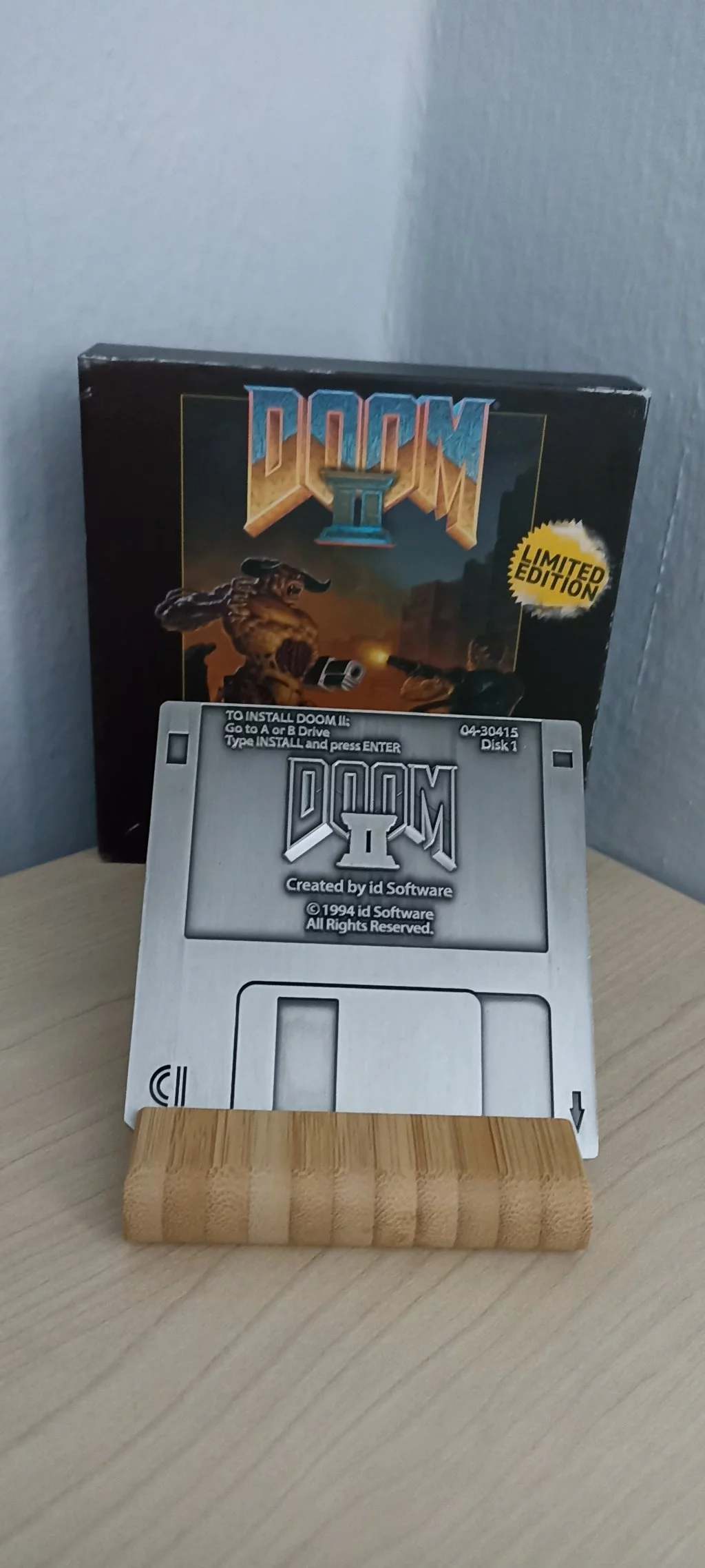 Kovová replika diskety s legendární FPS střílečkou Doom II je oslavou skromných začátků této série a toho, jak moc se v průběhu let vyvinula. Tato replika diskety DOOM II je celosvětově omezena na 5 000 kusů, měří přibližně 8,8 x 8,8 cm a je individuálně číslovaná. Součástí krabičky je stojánek.