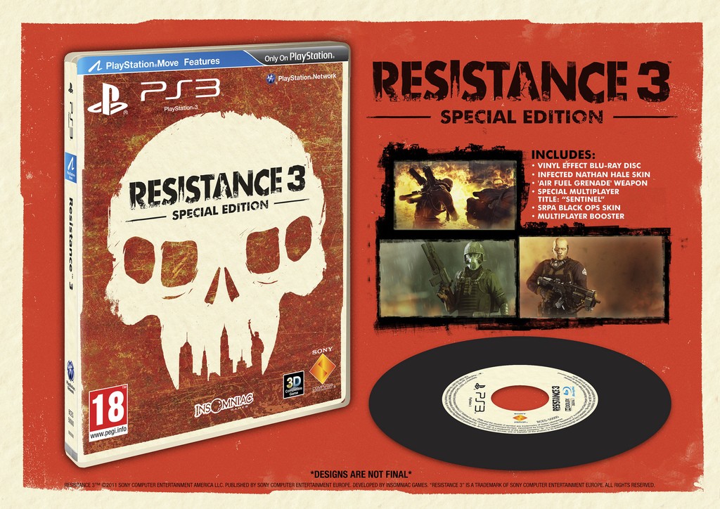Válka proti rase Chimera pokračuje v nejnovějším díle úspěšné herní série pro PlayStation 3. Ujměte se role Josepha Capelliho a vypravte se na hrdinské dobrodružství ve Spojených státech amerických. Zde se setkáte se zbytky lidstva, které přežily brutální invazi rasy Chimera, která se odehrála v Resistance 2. Vyzkoušejte si propracovaný režim spolupráce založený na třídách postav a také rozsáhlé režimy více hráčů zasazené do různých míst světa, například do Čadské republiky v Africe. Využívejte celý arzenál osvědčených i nových ničivých zbraní, jako jsou Bullseye a Marksman.Speciální edice obsahuje hru s vinylovým efektem, skin infikovaného Nathana Halea, bonusovou zbraň, speciální titul do multiplayeru – Sentinel, SRPA Black Ops skin, multiplayerový booster Obrázek zde .