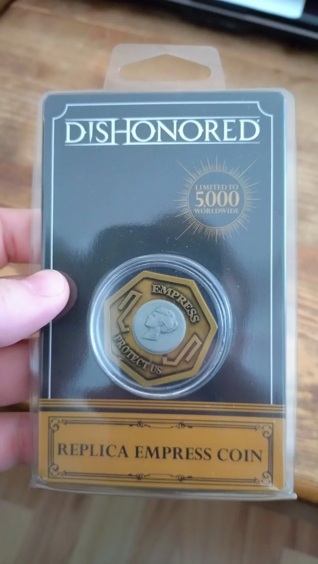 Sběratelská mince Dishonored vydaná společností Fanattik je limitovaná na 5000ks celosvětově, embosovaná z obou stran a každý kus je jedinečně číslovaný. Baleno ve sběratelském blister balení.