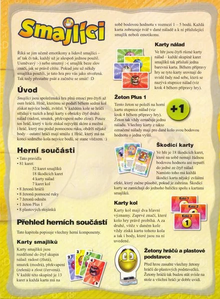 Karty smajlíků vyjadřáují čtyři různé emoce (radost, smutek, překvapení a zlost) a každá karta má navíc ještě číselnou hodnotu. Hráči vykládají karty před sebe a snaží se získat nejvíce bodů a tím vyhrát kolo. V každém kole je však jedna řada karet zvýhodněna (za každou kartu v dané řadě získá hráč jeden bod navíc) a jedna řada není bodována vůbec.